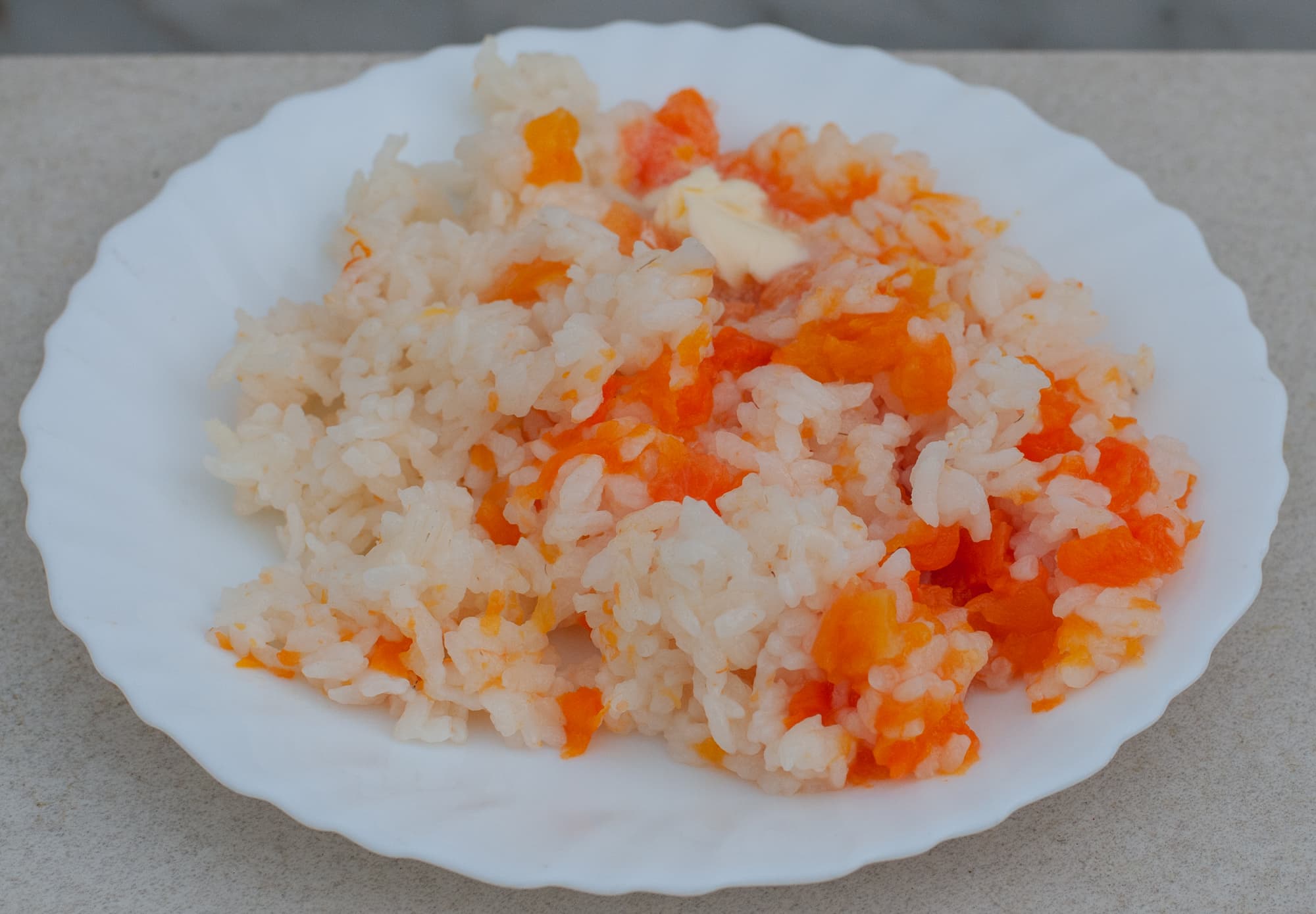 Для каши мы взяли 2 пачки замороженной тыквы и круглозерный рис.