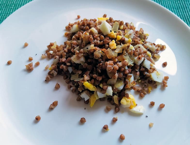 Параллельно готовим заправку: отвариваем вкрутую яйца, а лук обжариваем до золотистого цвета, солим. Когда каша подойдет, лук и мелко порубленные яйца аккуратно вмешиваем в нее, не приминая. При желании на этом этапе можно добавить еще соли.
