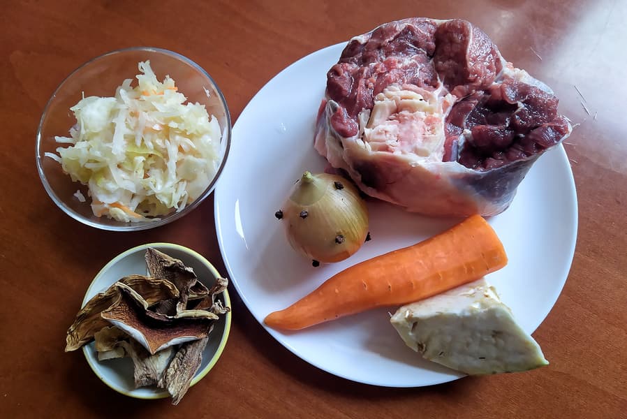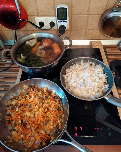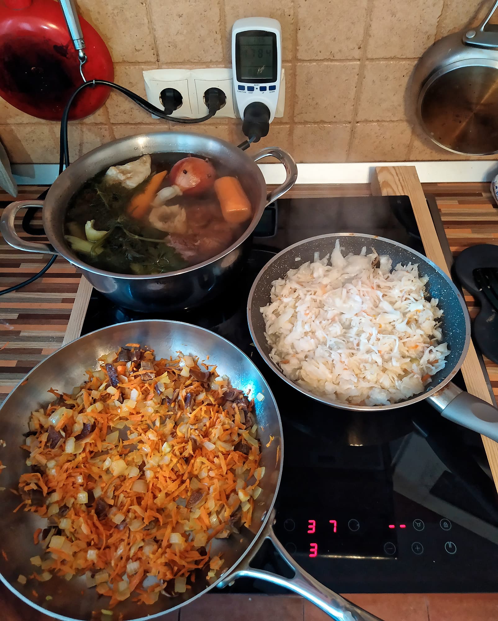 Пока варился бульон (это заняло два с небольшим часа), мы совершили остальные необходимые приготовления. Залили сухие грибы горячей водой, затем натерли морковь, нарезали лук и стали их пассеровать в масле, добавив чуть погодя отмокшие и порезанные грибы. В соседней сковородке тушилась квашеная капуста.