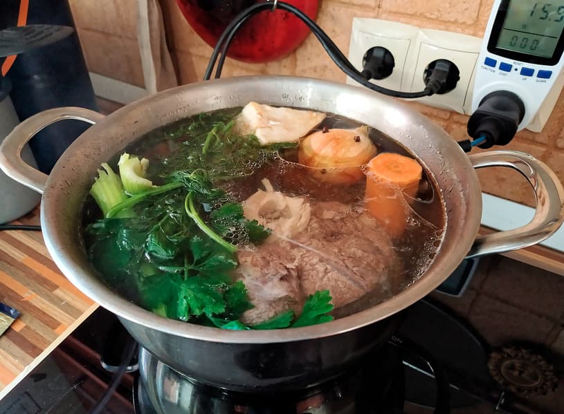 Килограммовый кусок телячьей ноги залили тремя литрами фильтрованной воды и довели до кипения. Сняв пену, добавили в бульон припеченные на сухой сковороде луковицу и морковь, стебель сельдерея, лавровый лист, душистый перец и на небольшом огне (в данном случае это был режим 3) оставили с чуть приоткрытой крышкой на 7 часов. Периодически приходилось поворачивать кастрюлю: как уже упоминалось, конфорки иногда греются неравномерно, и пока с одной стороны бульон кипел, с другой он начинал покрываться пленкой. Иногда приходилось поднимать мощность до 4, чтобы оживить наше варево, затем снова снижать до 3 для поддержания заданного темпа. По прошествии 7 часов бульон, как и планировалось, уварился вдвое. За это время энергопотребление составило 3,1 кВт·ч, максимальная зафиксированная мощность — 3696 Вт.