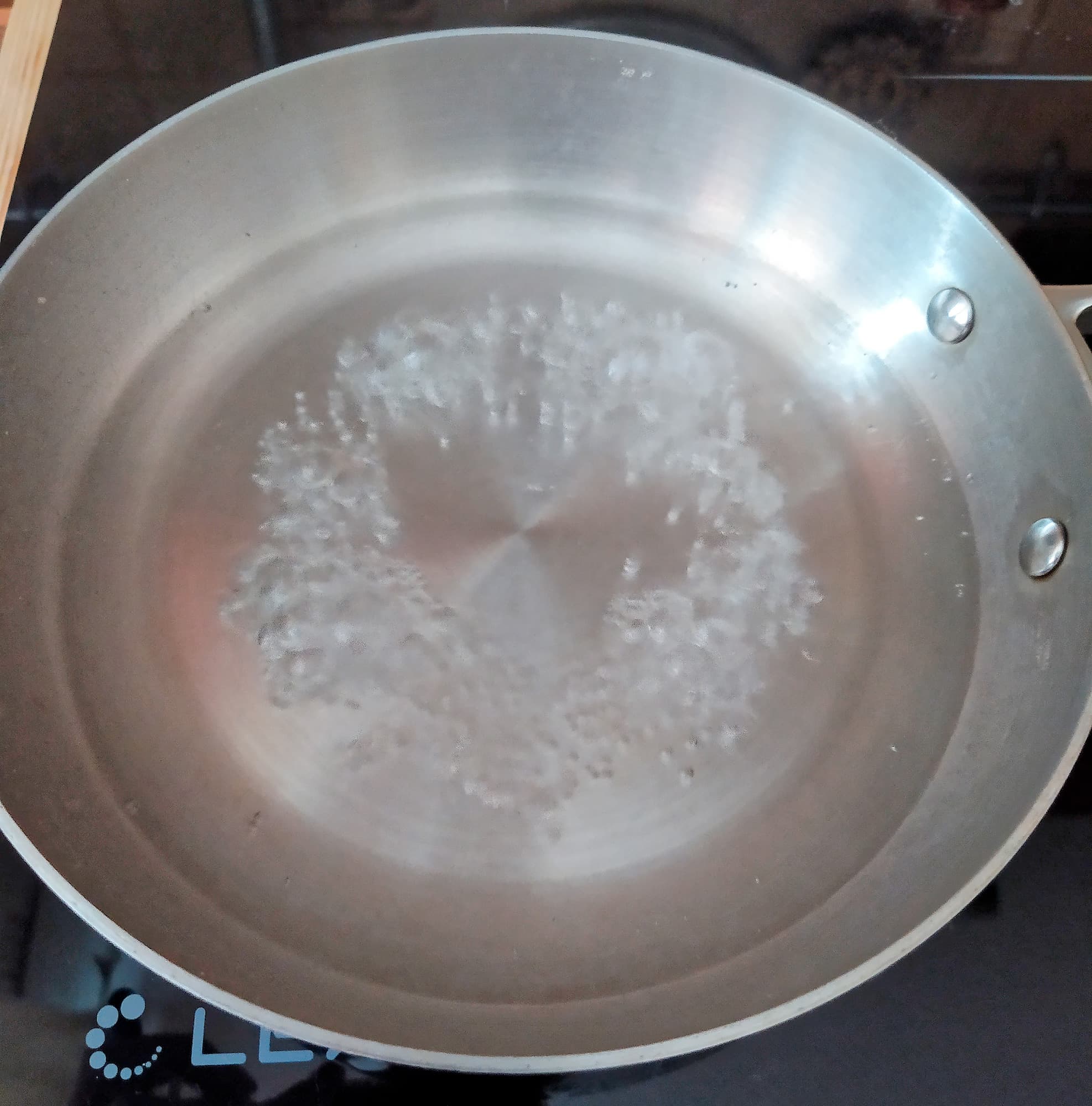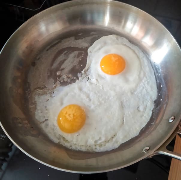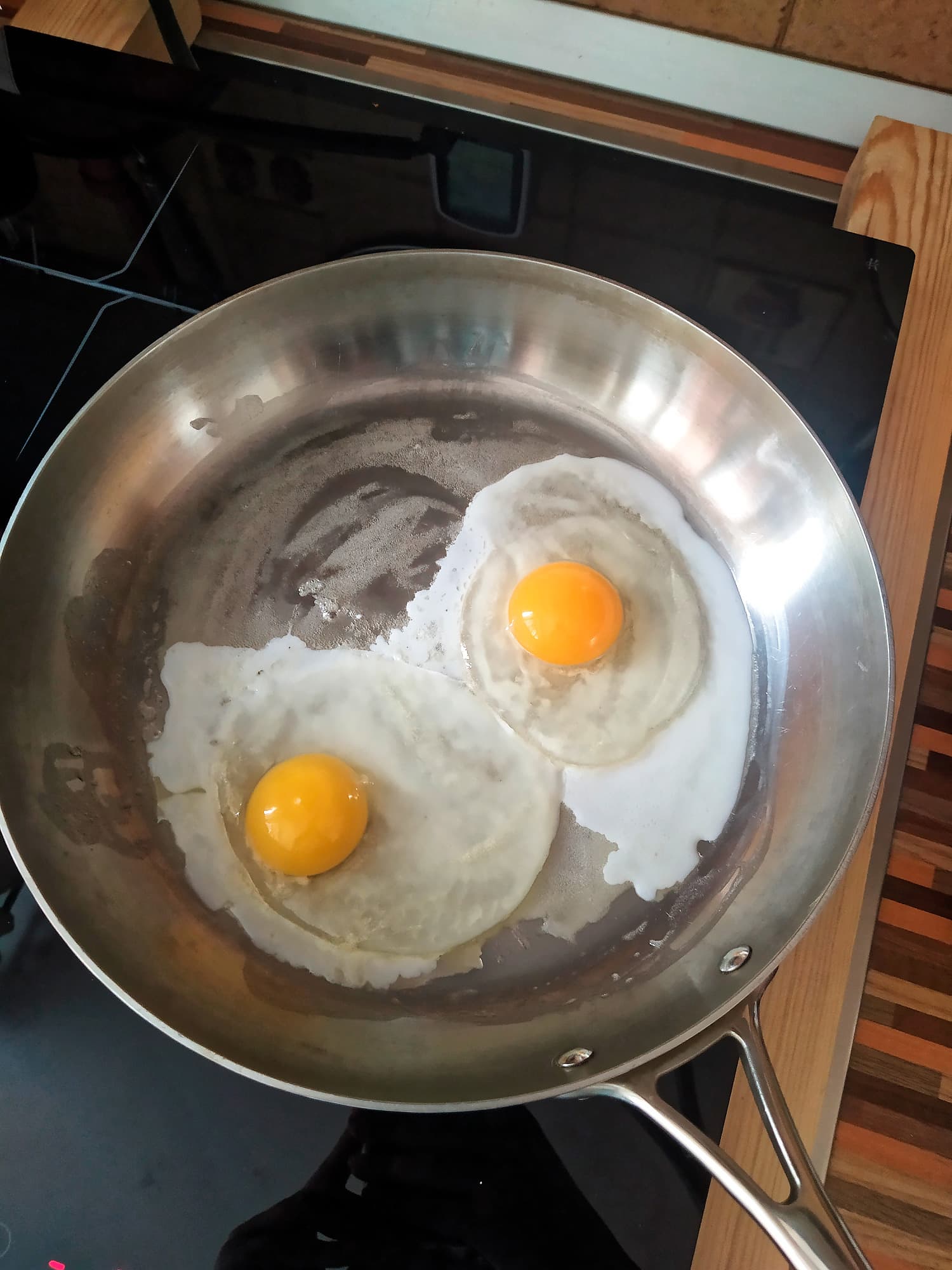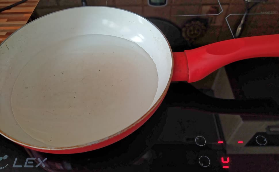 Элементарный тест, чтобы проверить, равномерно ли нагревается поверхность. Разогрели сковороду в режиме 5, бросили на нее немного сливочного масла вперемешку с кокосовым, как только разошлось — разбили яйца.