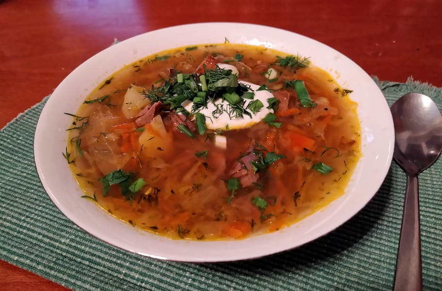 Готовый бульон процедили и забросили в него еще немного сухих грибов, но на этот раз смолотых в порошок, и картошку. Когда она почти сварилась, добавили зажарку, снятое с кости и порезанное мясо, а чуть погодя — притушенную капусту. А потом и сырой квашеной бросили для остроты вкуса. Ну и немного сушеного укропа для полного счастья. На все про все у нас ушло 3,5 часа. За это время, согласно показаниям ваттметра, энергопотребление составило 2,2 кВт·ч, а максимальная зафиксированная мощность — 2490 Вт.