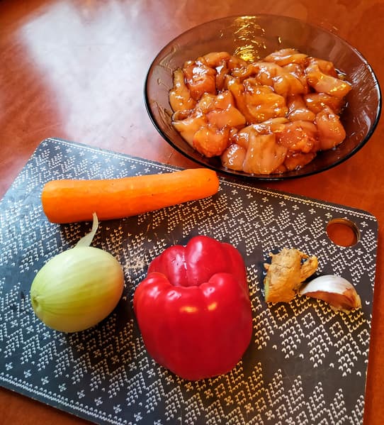 Сегодня мы взяли 400 граммов куриного филе и замариновали его в смеси соевого и устричного соусов, чуть присыпав кукурузным крахмалом. Курицу отставили в сторону и занялись овощами: лук порезали перьями, морковь и красный сладкий перец — соломкой.