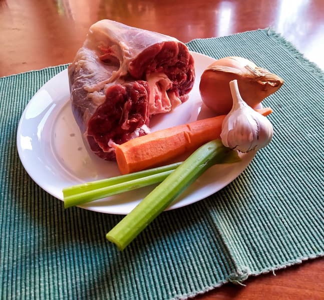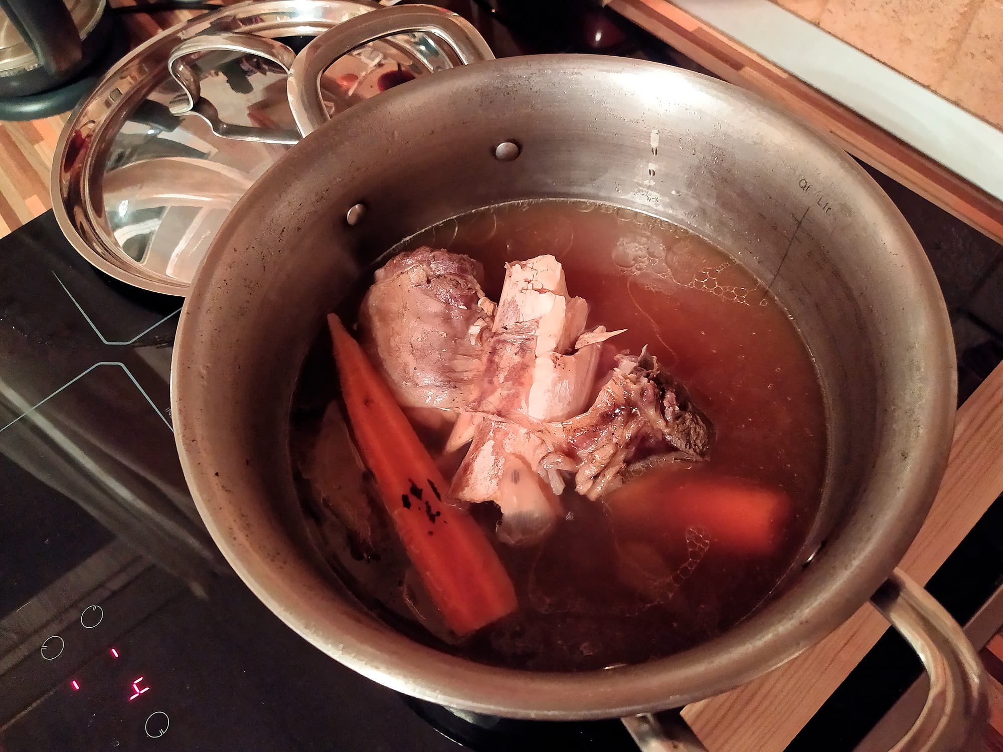 Итак, бульон. Хороший кусок говядины с мозговой косточкой залили водой и довели до кипения на сильном огне. Тщательно сняли пену, забросили к мясу луковицу, утыканную гвоздикой, морковь, кусок корня сельдерея, букет гарни и оставили вариться на слабом огне под чуть приоткрытой крышкой.