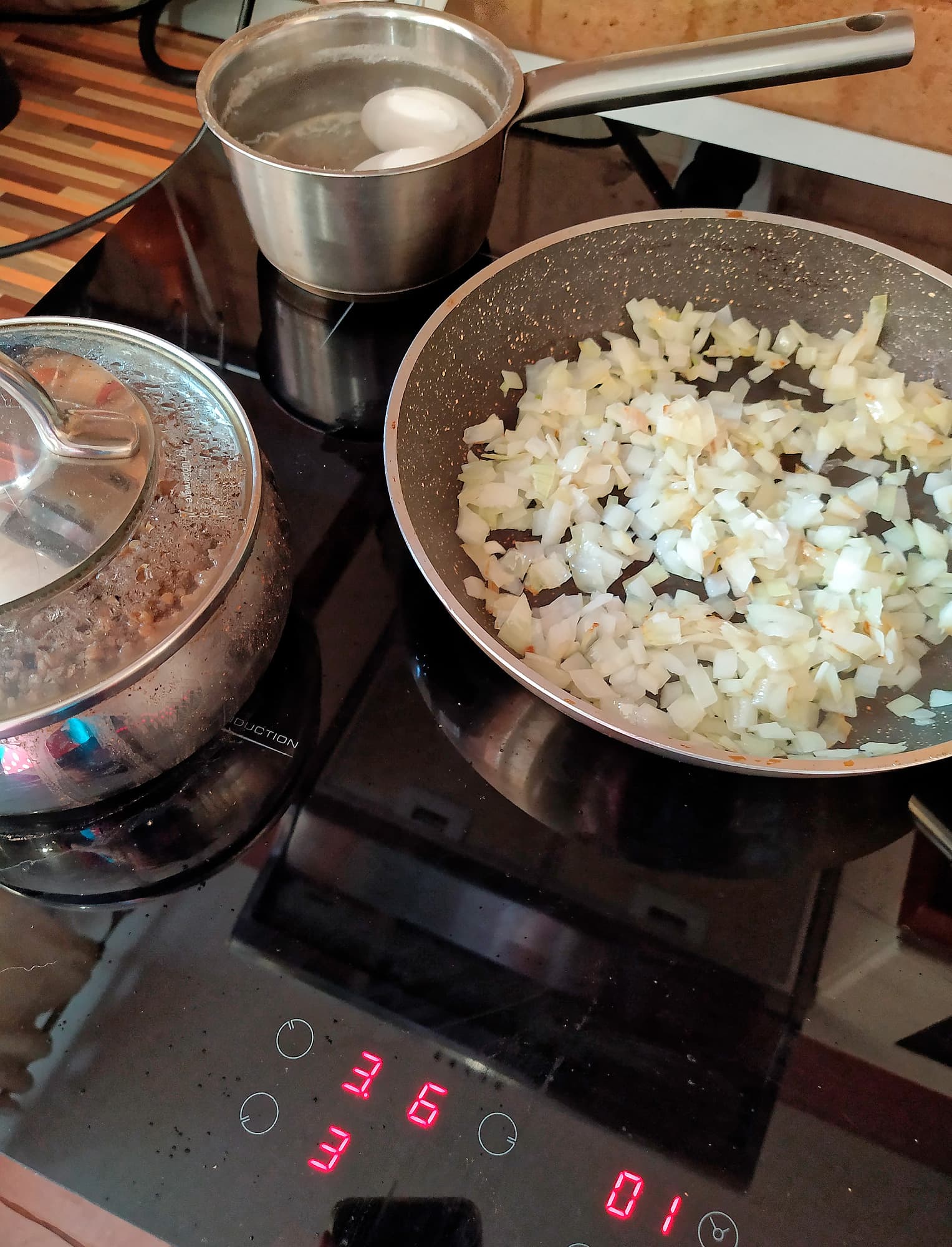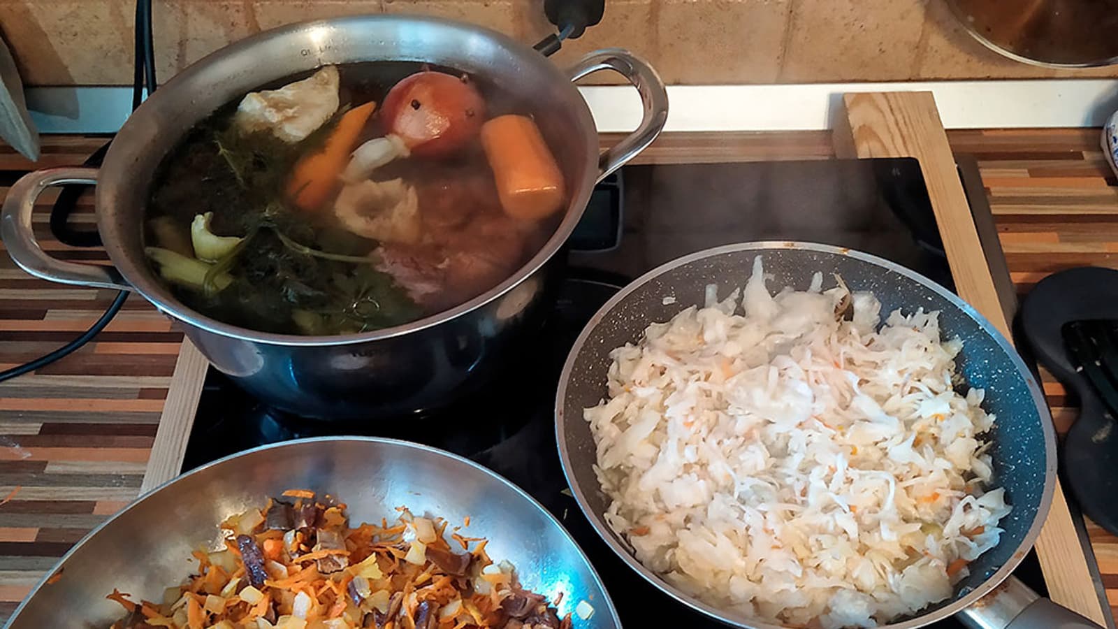 Какая русская кухня обойдется без наваристых щей! А для нас это еще и отличный способ проверить, как варочная панель ведет себя в условиях многозадачности, ведь пока варится бульон, нам нужно будет сделать зажарку и потушить квашеную капусту.