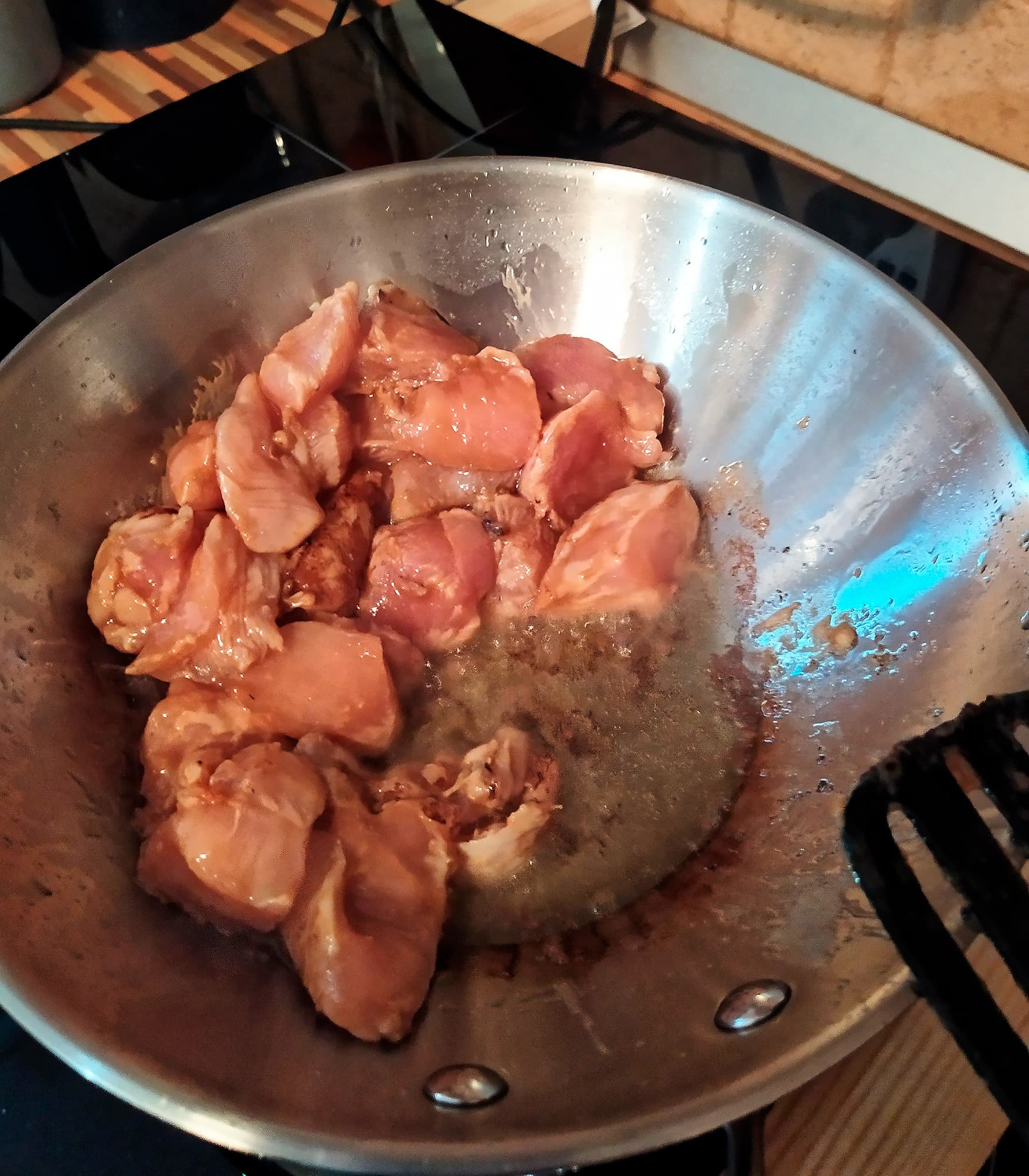 В воке на максимальной мощности разогрели масло, забросили туда курицу. Сок, выделяющийся из мяса, активно кипел, шипел и испарялся, так что мы получили именно то, к чему стремились: быструю обжарку. Оказалось, что режим 9 — это даже слишком, так что убавили до 7.