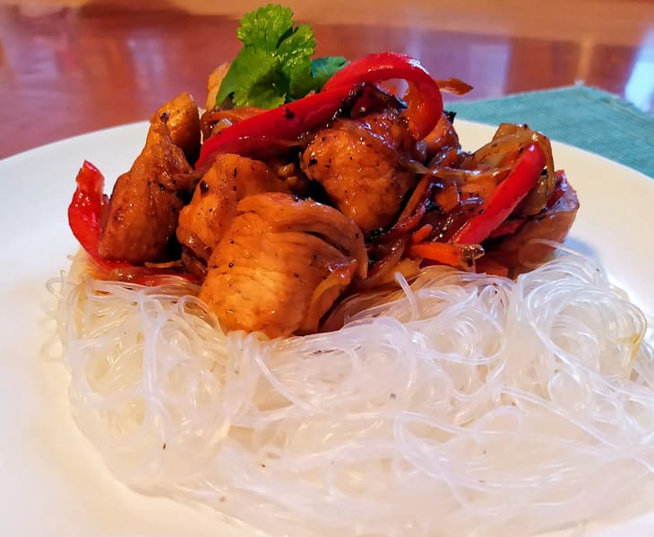 Готовую курицу из вока выложили. К этому времени закипел чайник — залили горячей водой фунчозу на гарнир. А в вок налили еще немного масла и бросили в него порезанный кусочек имбиря и чеснок. Когда чеснок стал менять цвет, загрузили морковь, через пару минут — лук, а чуть позже — и перец. Когда овощи поджарились, но еще не успели размякнуть, добавили столовую ложку меда, плеснули соевого соуса, вернули в вок курицу и в течение пары минут прогрели все вместе. Плита работала 20 минут, энергопотребление составило 0,03 кВт·ч.