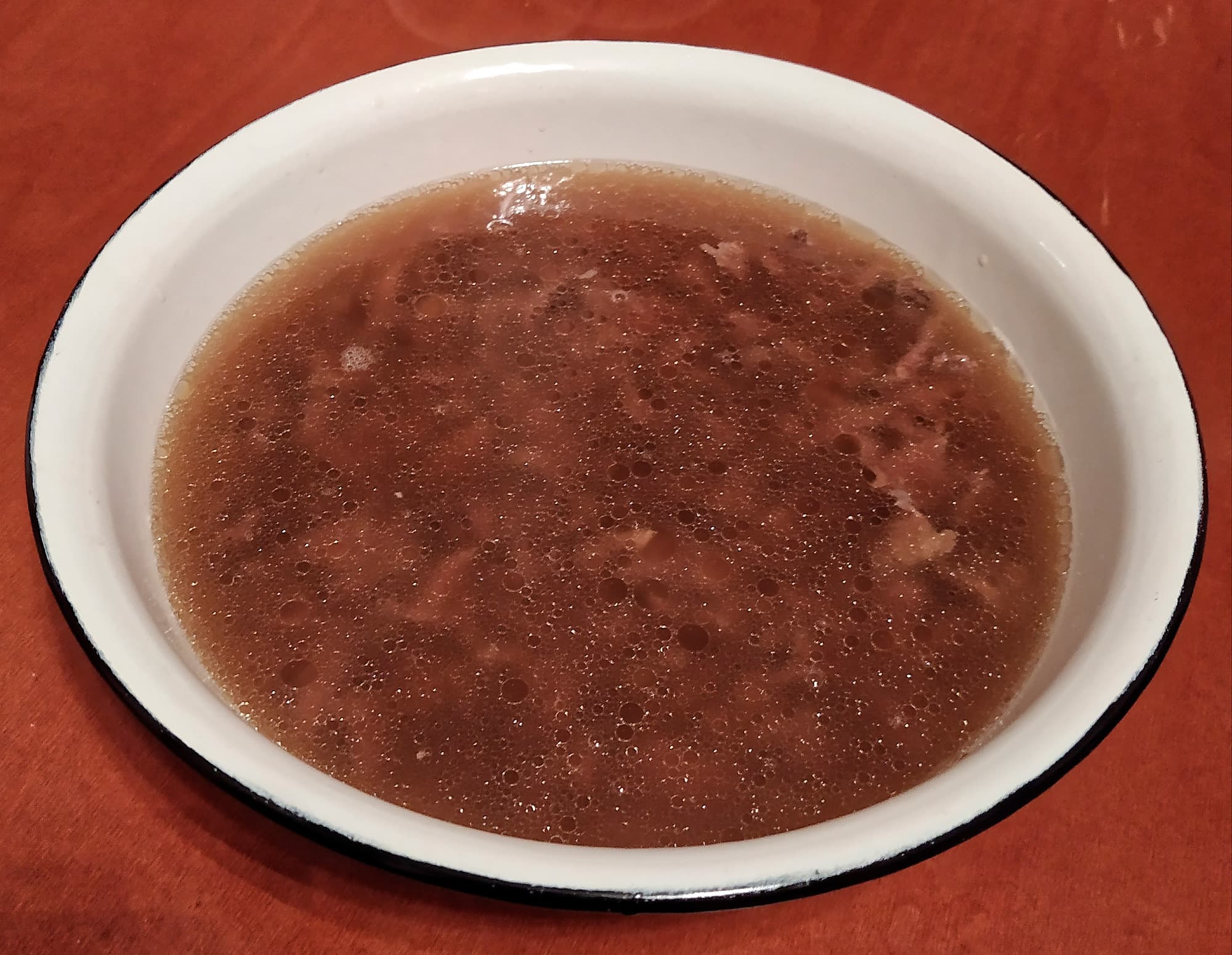 Мы забросили в бульон порезанный чеснок и, не вынимая мяса, отправили немного подостыть. С охлажденного бульона сняли жир, сам бульон процедили. Мясо разобрали на волокна, уложили в миску, залили бульоном и поставили в холодильник.