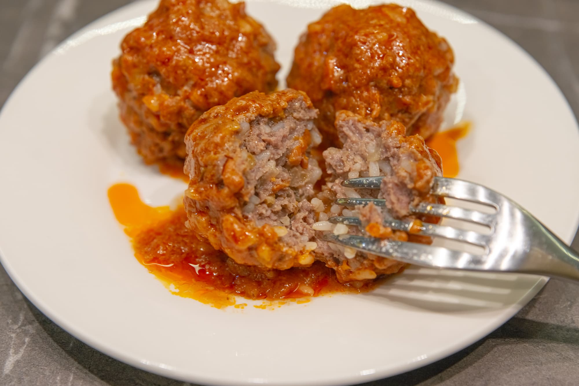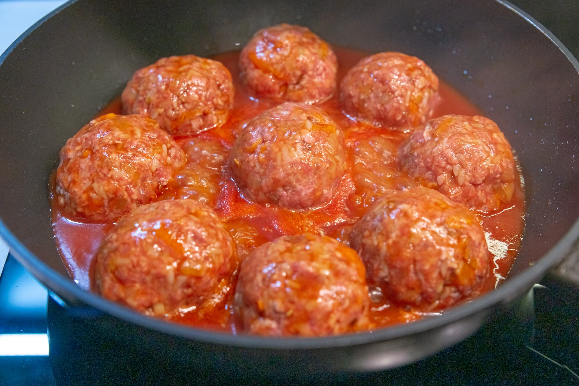 В томатный соус добавили соль и хмели-сунели. Овощи, фарш и заранее сваренный рис посолили, поперчили и тщательно перемешали. Сформировали шарики среднего размера, выложили в раскаленную сковородку, залив томатным соусом, и закрыли крышкой.