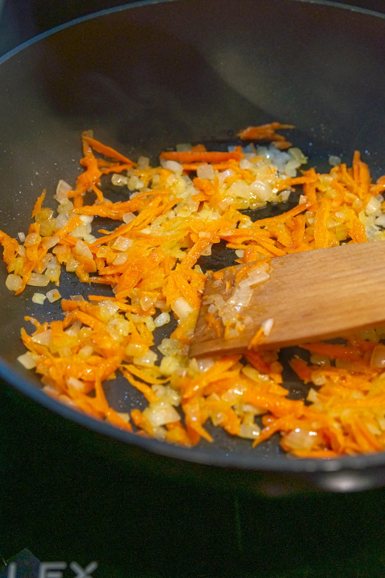 Лук и морковь обжарили на максимальном режиме в течение 3 минут.
