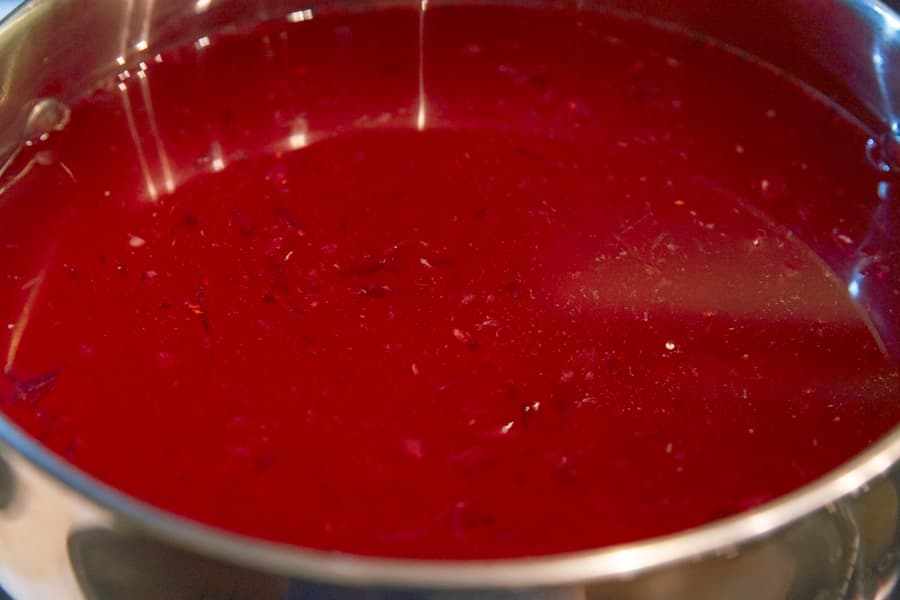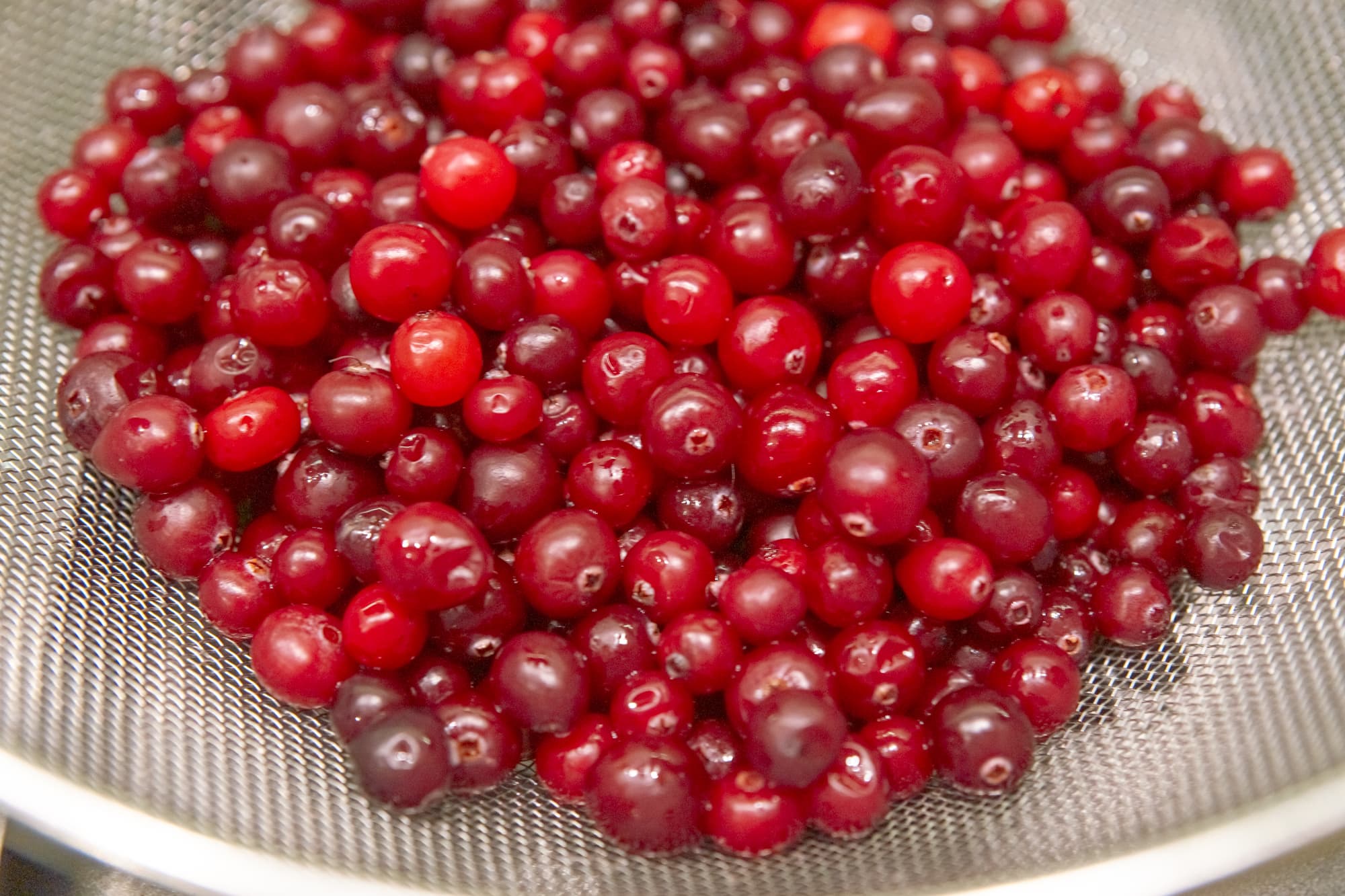 Клюква с дачи наконец дождалась своего часа. 300 граммов свежей ягоды размолотили блендером и протерли через сито, отделив таким образом жмых от пюре с соком. Жмых залили водой так, чтобы один стакан остался для крахмала.