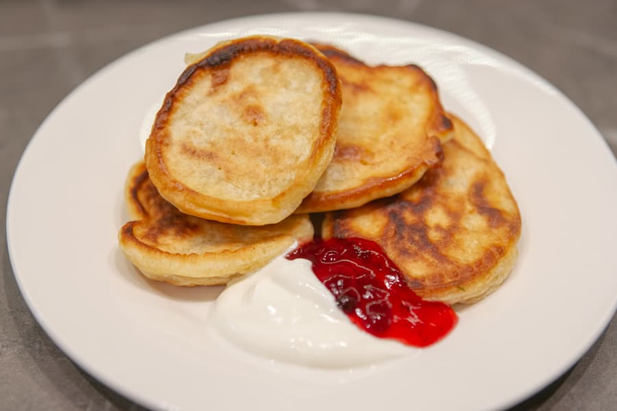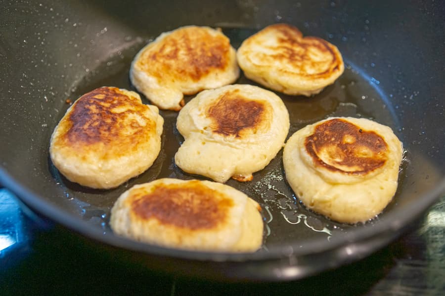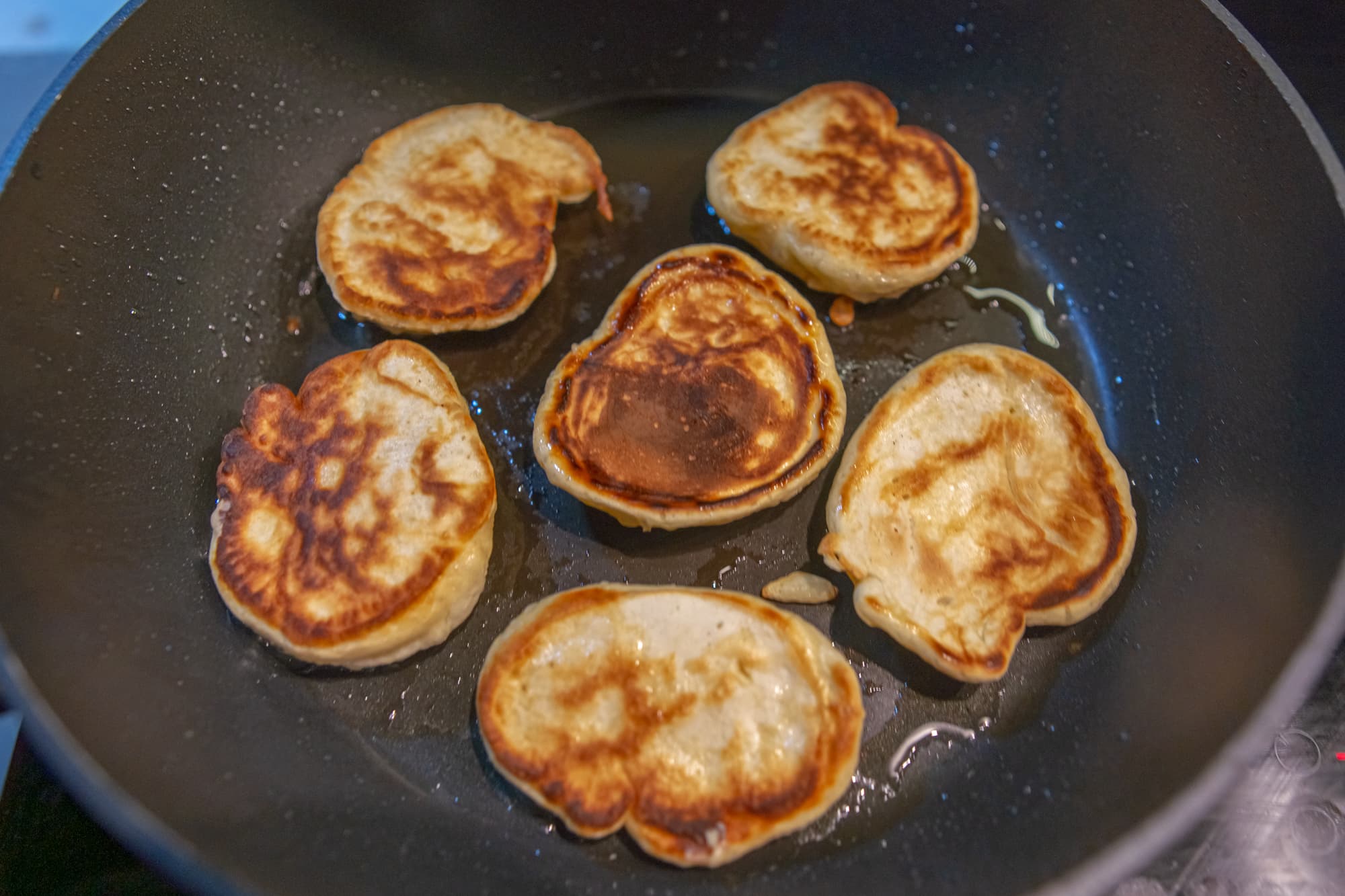 Ингредиенты: молоко — 200 мл, мука — 1,5-2 стакана, яйцо — 1 шт., 1-2 ст. л. сахара, 1 ч. л. разрыхлителя, соль и растительное масло для жарки