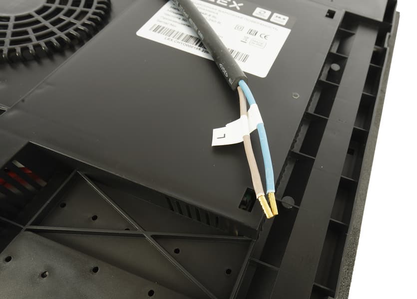 Со стороны дна — большой круглый вентилятор, наклейка с технической информацией и выход кабеля.