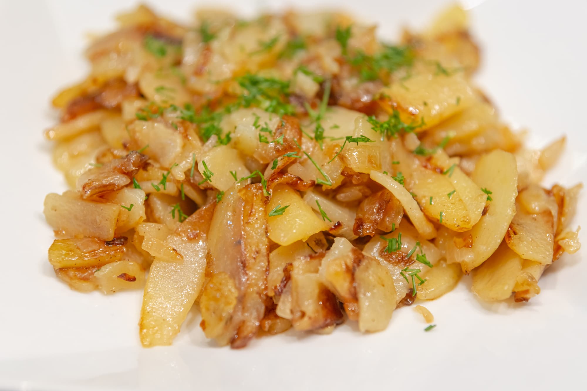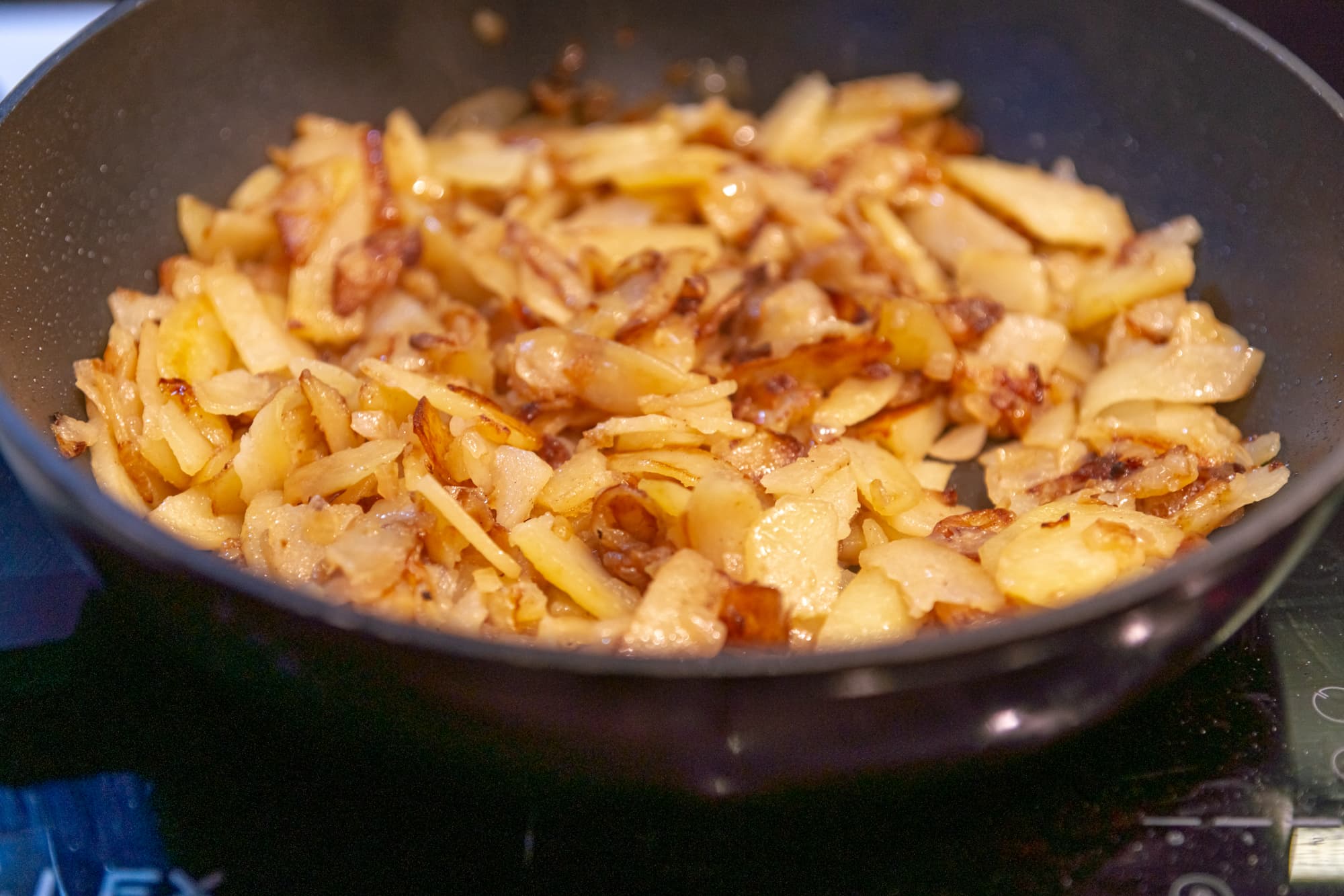 В общей сложности, учитывая нагрев сковороды и отдельную обжарку лука, на приготовление блюда ушло порядка 25 минут. Ни один ломтик не подгорел, прожарка идеальная, сырых кусочков не обнаружено.