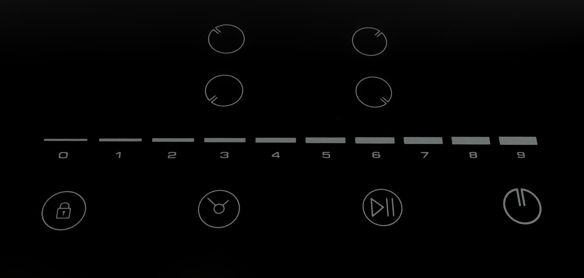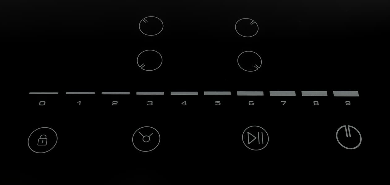 Сенсор со шкалой мощности нагрева от 0 до 9 расположен по центру и управляет каждой из конфорок. Над слайдером располагаются сенсоры конфорок с понятными изображениями.