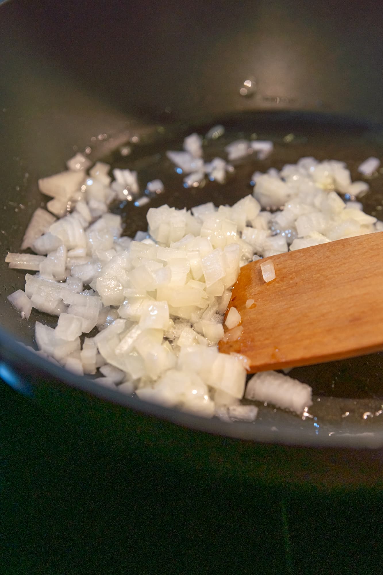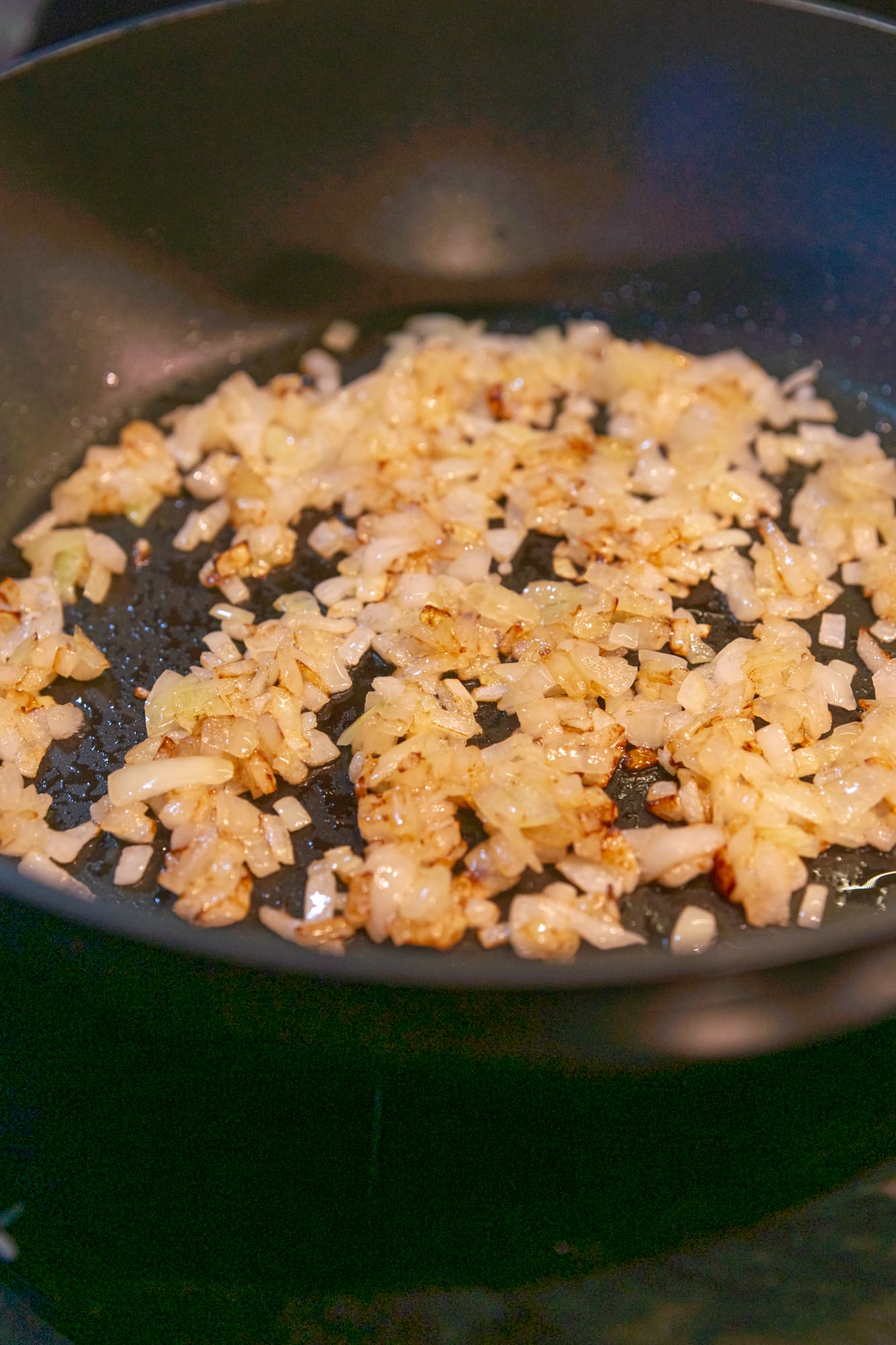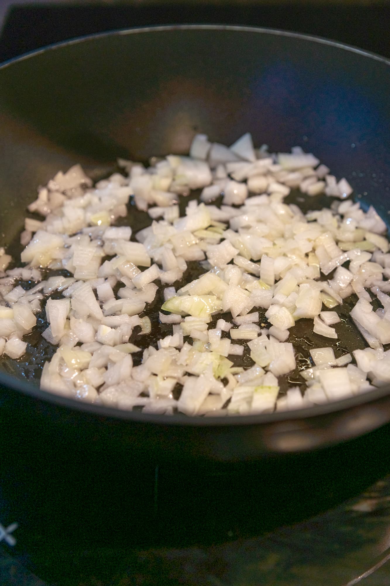 Очищенный картофель нарезали, промыли и оставили подсушиваться на дуршлаге. За это время на раскаленную сковородку кинули мелко нарезанный лук и обжарили его до золотистой корочки на 8-м режиме в течение 4 минут.