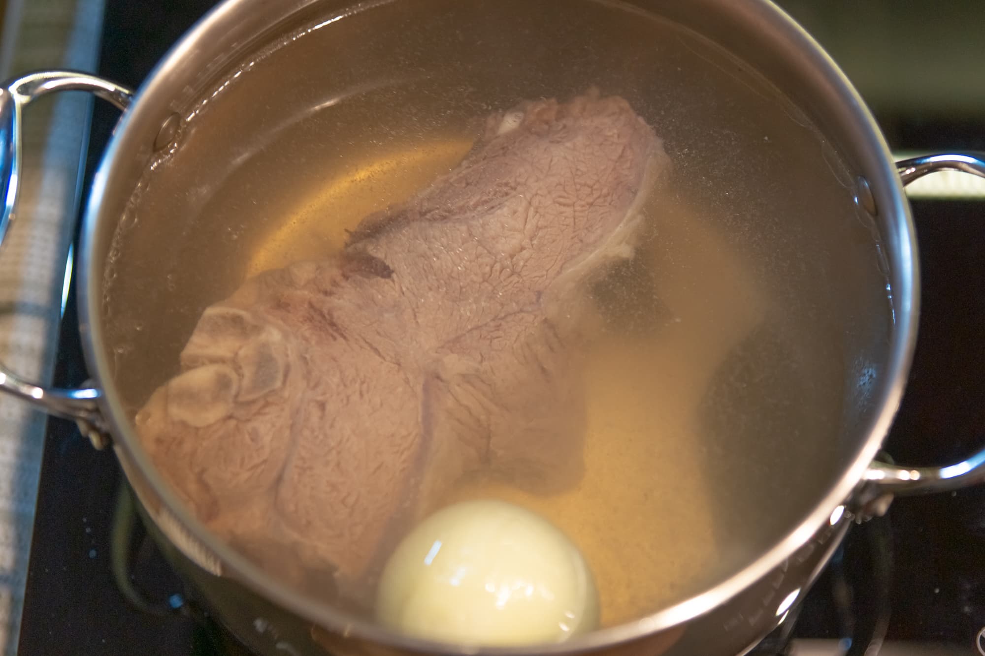 Кусок говядины из поясничной части мы промыли и поместили в кастрюлю, добавив воды до отметки в 2,5 литра. На 9-м режиме за 10 минут довели бульон до кипения, снизили мощность до 4, убрали пенку, добавили луковицу, лавровые листья, соль и несколько горошин черного перца.