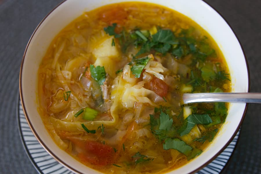 Позже, вынув сварившиеся окорочка, в готовый бульон добавили нарезанную кубиками картошку, пару помидоров, нашинкованную свежую капусту, морковно-луковую поджарку, поперчили, еще чуть позже туда же отправили срезанные с косточек кусочки курицы без кожи и получили вкусные наваристые щи.