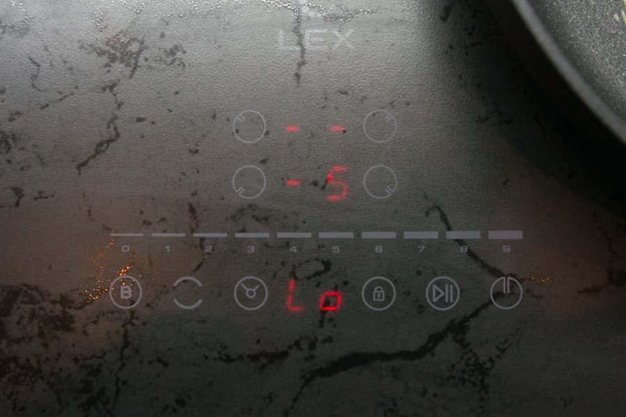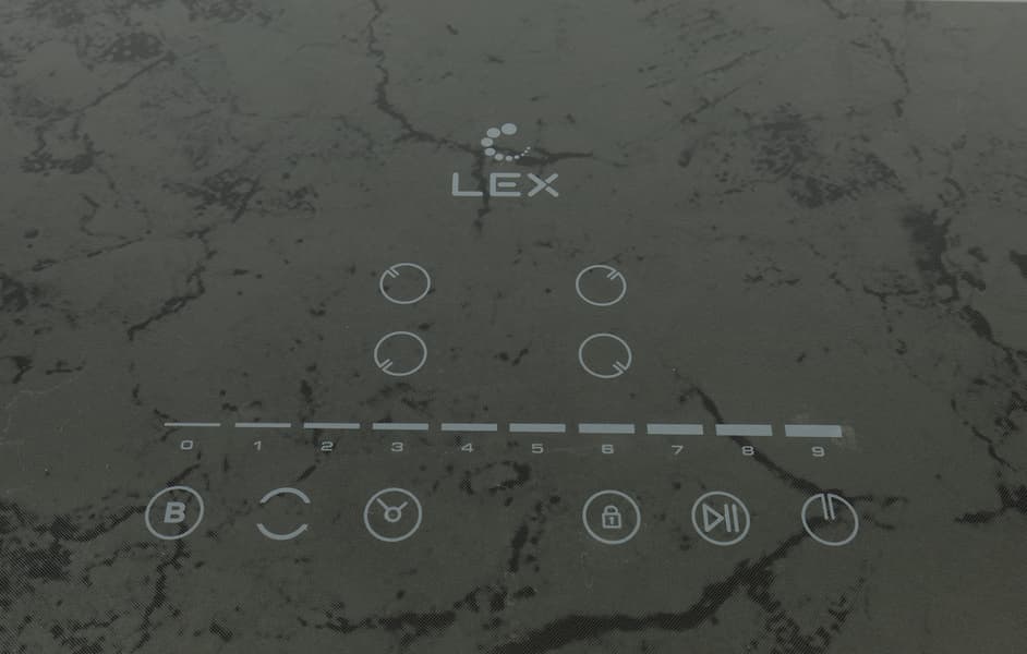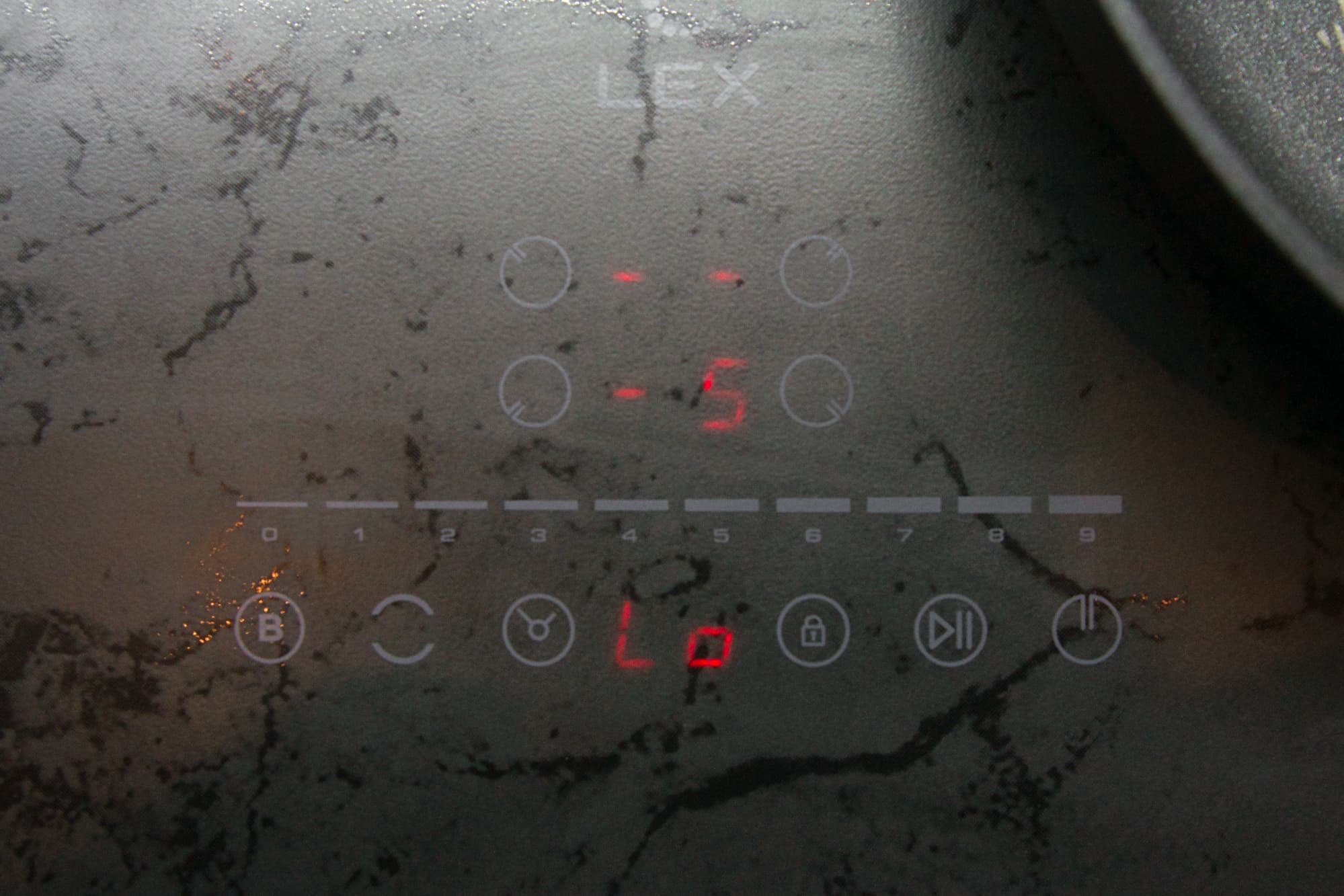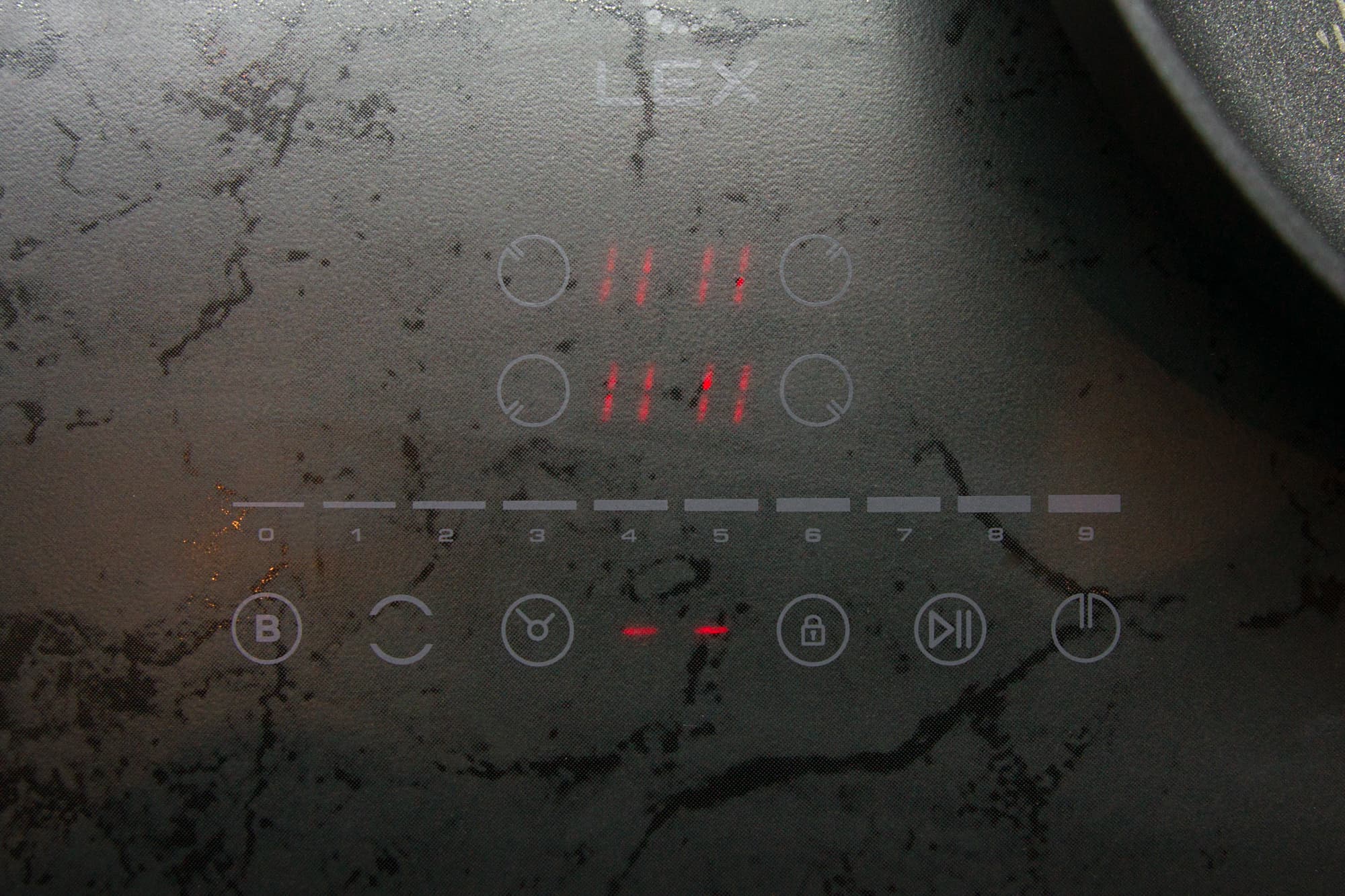 Панель управления Lex EVI 640 F DS состоит из ряда сенсорных кнопок (в самом низу), 9-ступенчатого слайдера для управления мощностью и четырех кнопок над ним, отвечающих за активацию зон нагрева.
