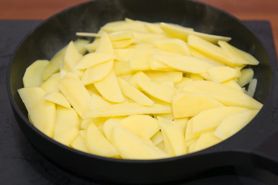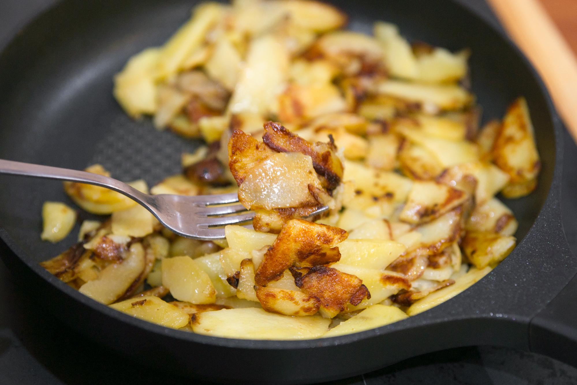Картофель обжаривался на дальней правой конфорке сначала на 8-м уровне мощности при частом помешивании, потом, когда он уже почти был готов и хорошо подрумянился, снизили мощность до 5, накрыли сковородку крышкой и довели блюдо до полной готовности.