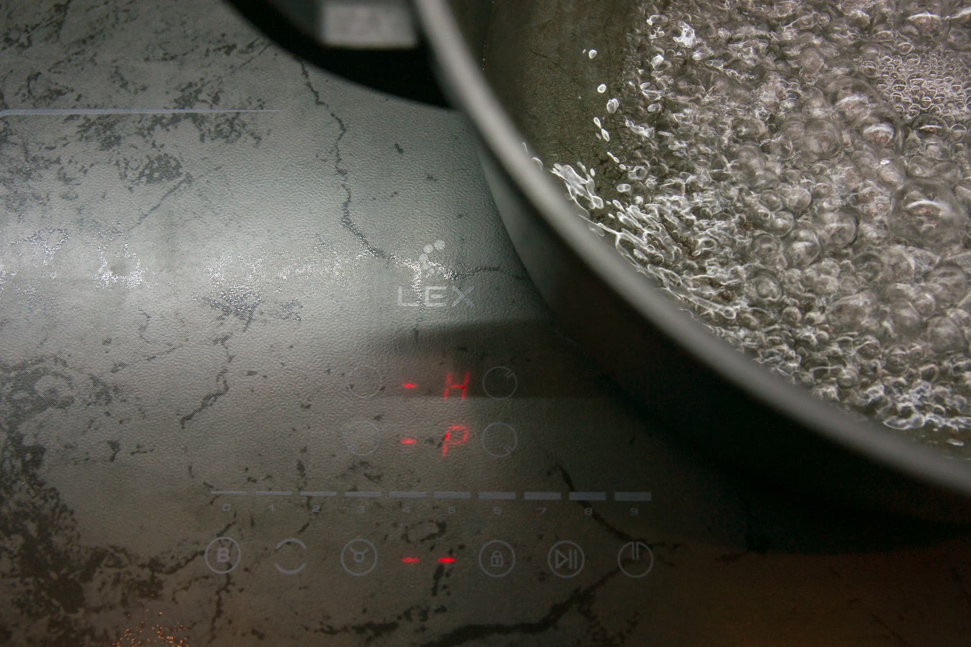 Для определения размера нагревательных элементов мы поставили на плиту емкость большого размера, налив в нее немного воды. Через несколько секунд придонные пузырьки обозначили конфигурацию нагревательного элемента: на мощности 8-9 это круг с пустотой внутри, в режиме Boost — круг с ровными краями без пустот по центру. Диаметр круга на всех четырех конфорках — 20-21 см.