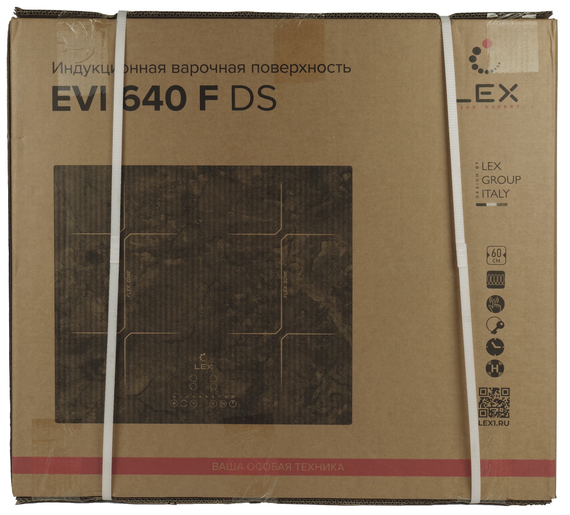 Варочная панель Lex EVI 640 F DS поступила к нам упакованной в большую плоскую коробку из прочного картона. На лицевой и обратной сторонах коробки размещены изображение устройства, полное название модели, логотип компании, перечислены ключевые особенности и краткие технические характеристики.