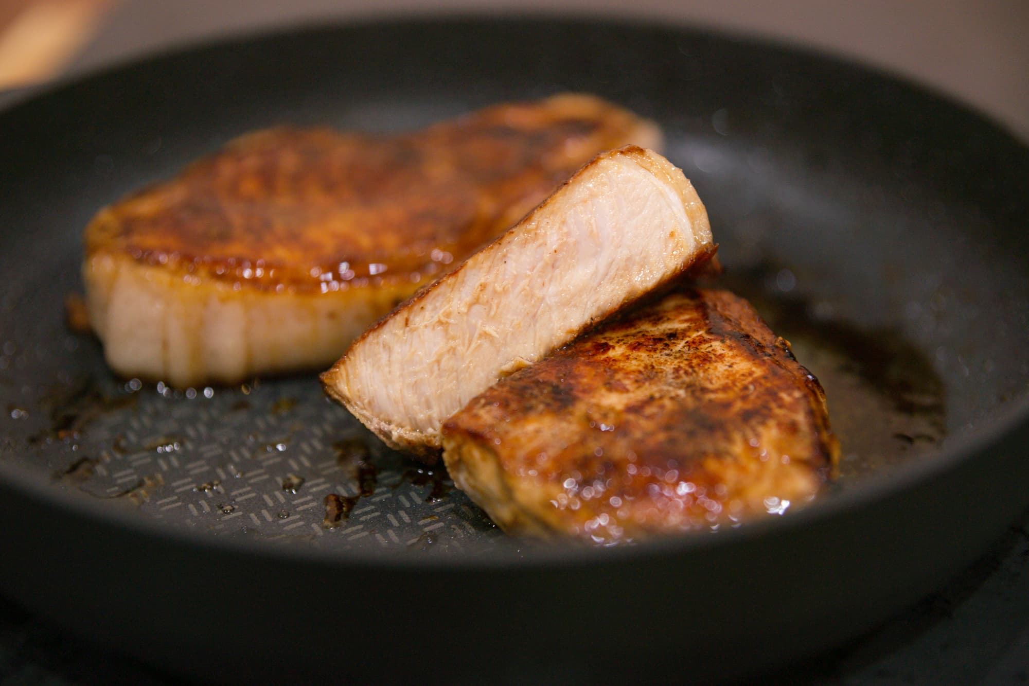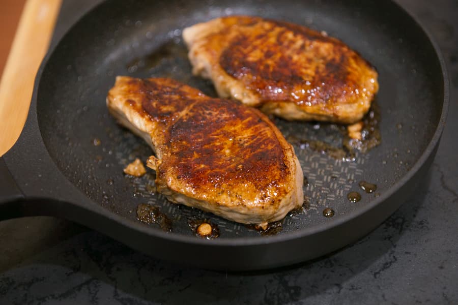 Затем снизили нагрев до 6 и еще через несколько минут получили сочные, равномерно прожаренные стейки с аппетитной корочкой.