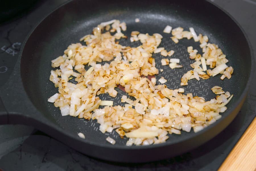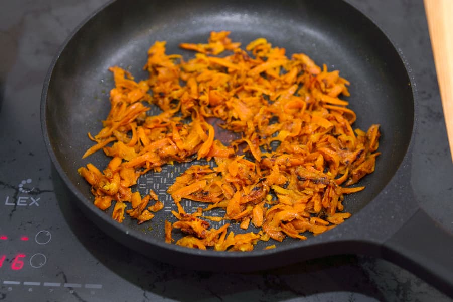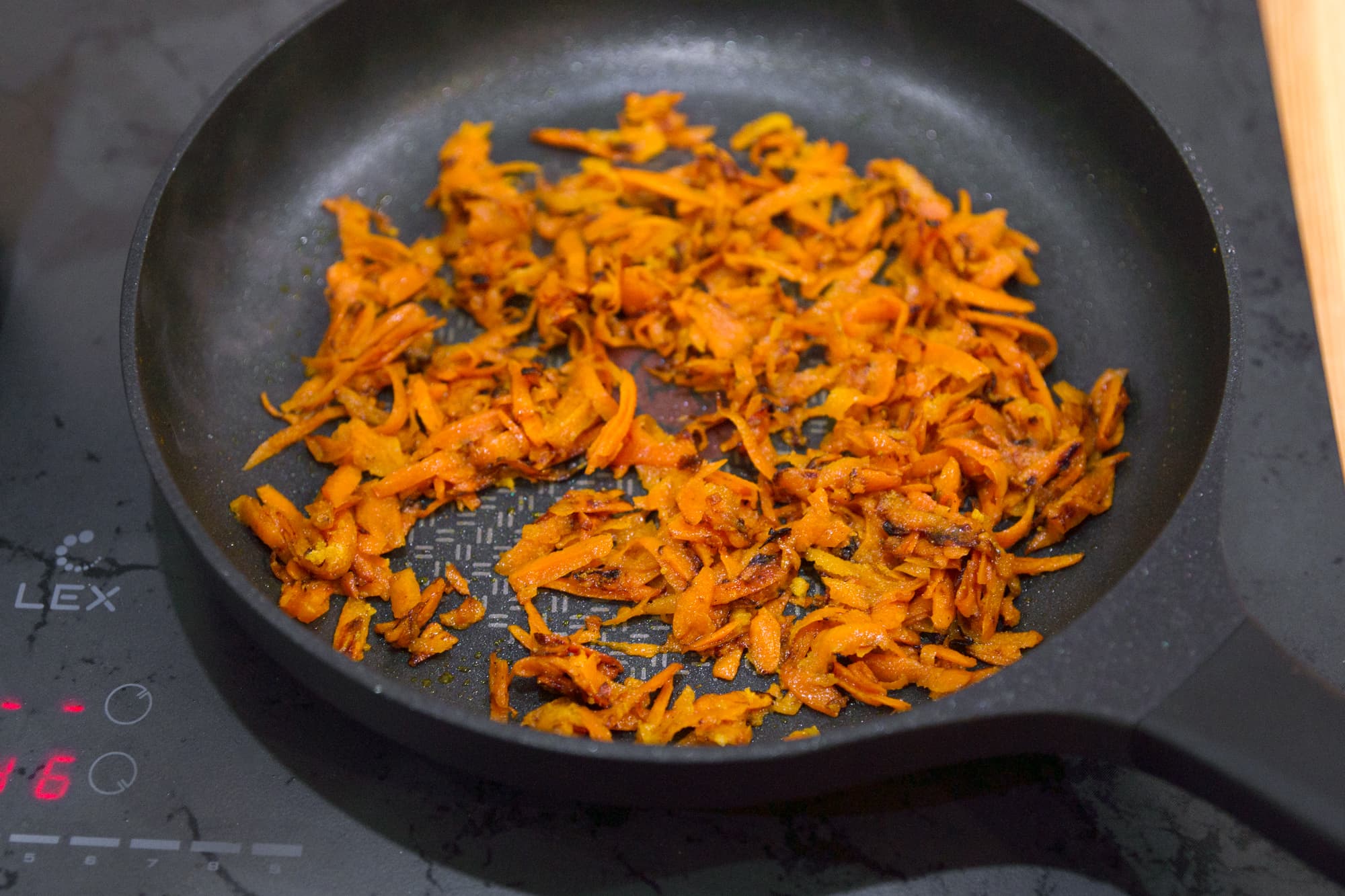 Тем временем на соседней конфорке обжаривались лук, а затем и морковь на уровне мощности 8—6. Тут всё ровно и предсказуемо.
