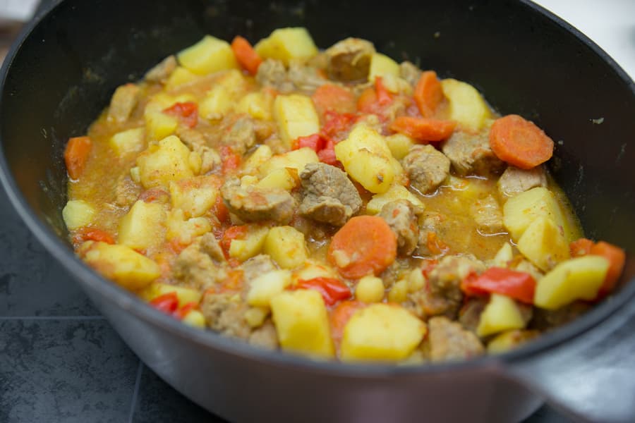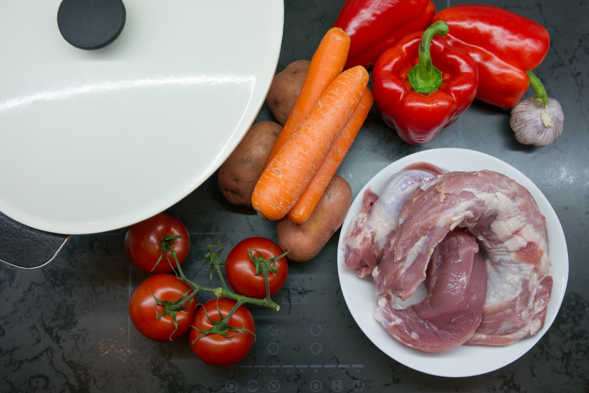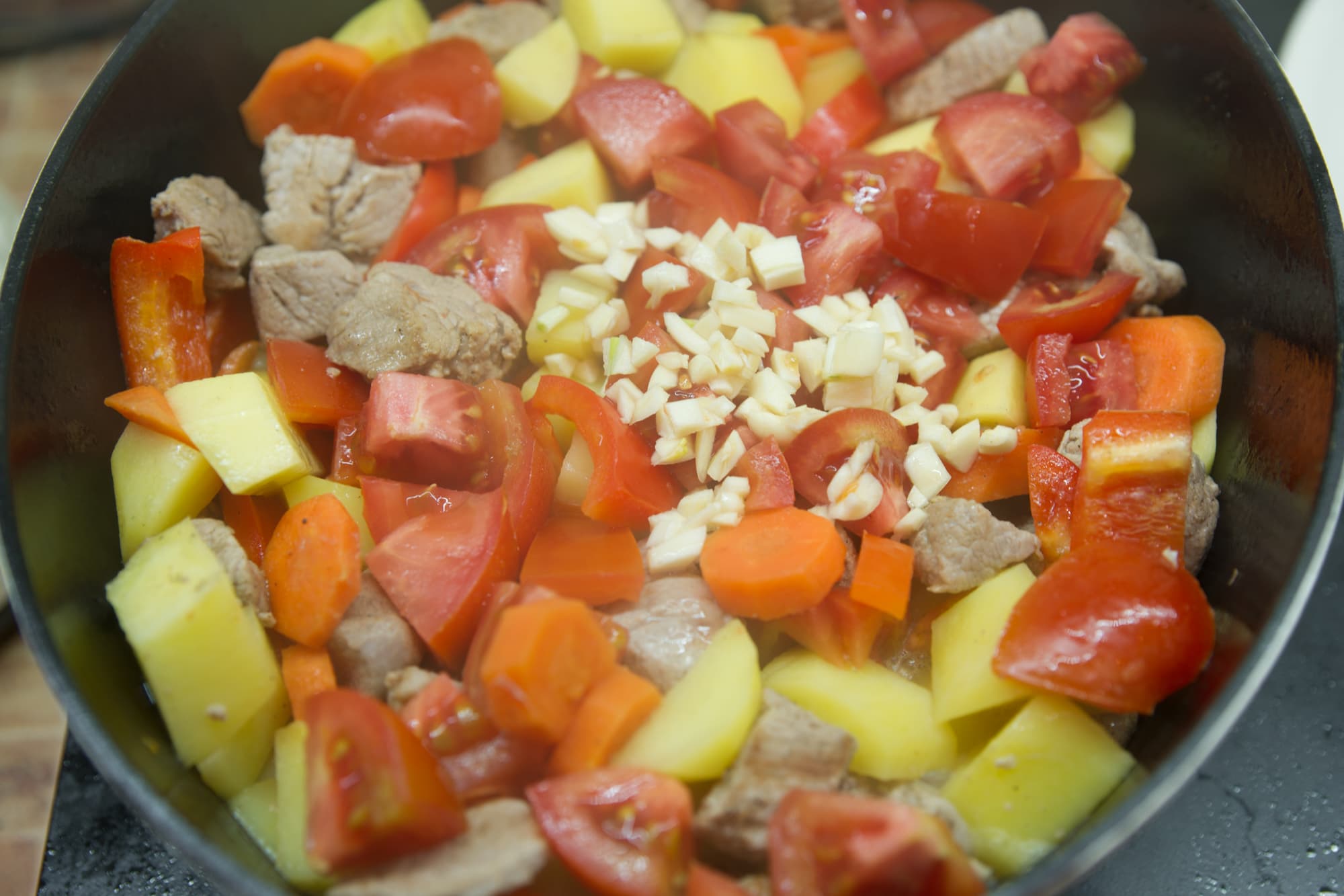 На объединенной зоне установили чугунную утятницу и разогрели ее на 9-м уровне мощности. Слегка обжарили свинину, затем снизили нагрев до 7 и опустили в посуду нарезанные небольшими кусочками картофель, морковь, болгарский перец, помидоры и мелко нарубленный чеснок.