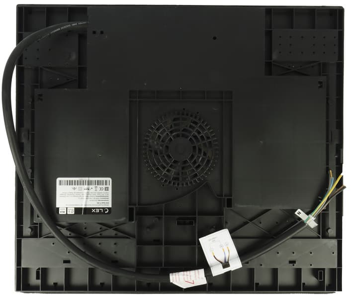 На дне есть вентиляционные прорези, посередине расположен вентилятор, а ниже — наклейка с технической информацией.