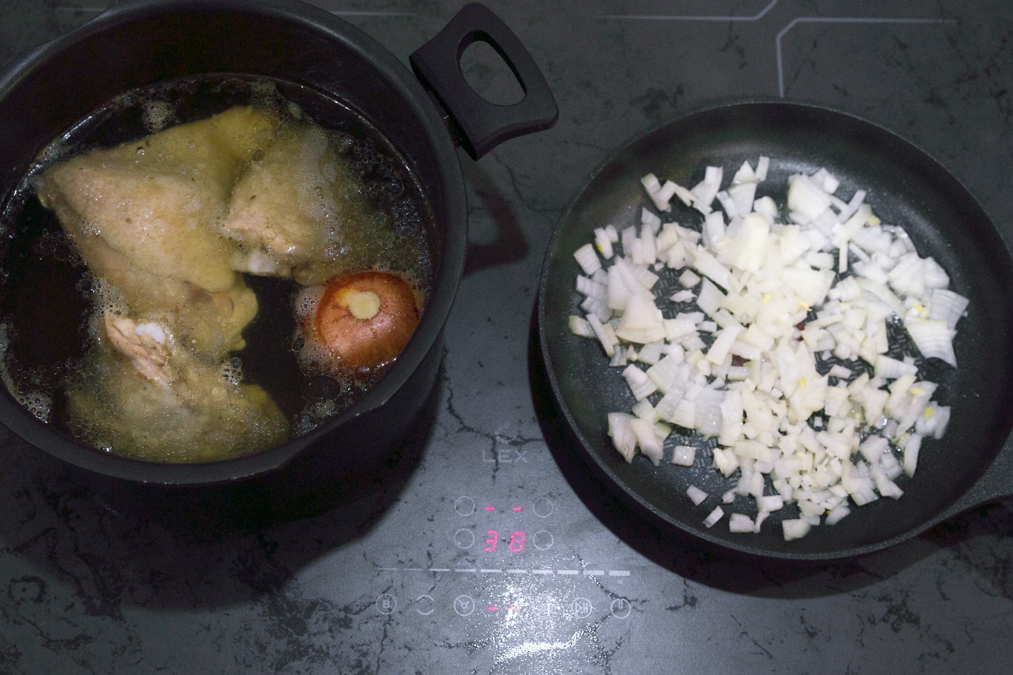 В кастрюлю поместили три окорочка, луковицу, залили водой, посолили и включили Boost. Когда вода закипела, уменьшили мощность до 3 и стали следить за показаниями термометра, опущенного в остывающий бульон. Напомним, наша цель — стабильное легкое кипение при 89—93 °C.