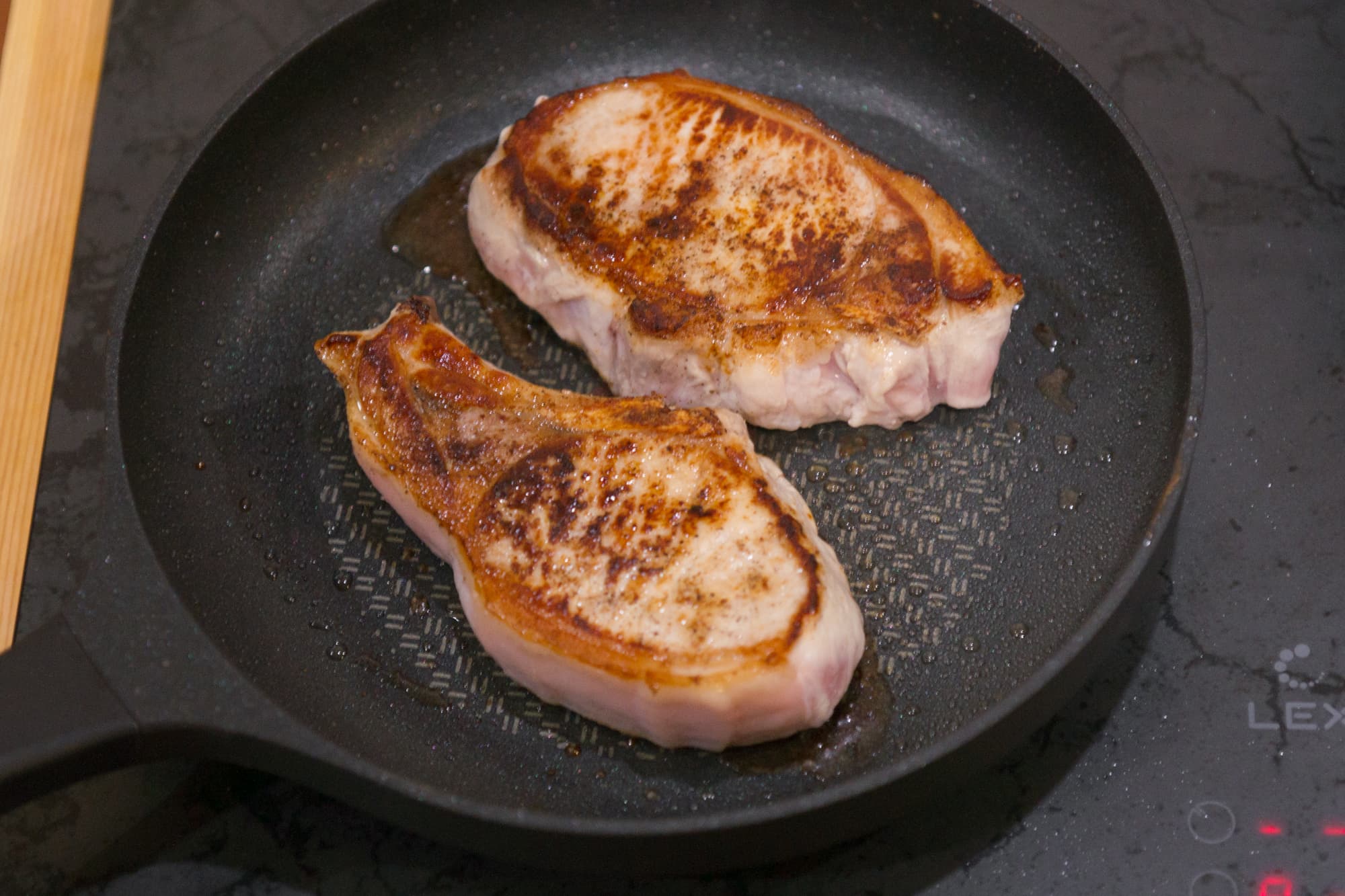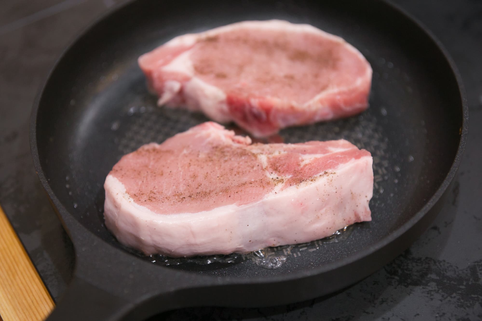 Два куска свинины посолили, поперчили и выложили на хорошо разогретую сковородку.