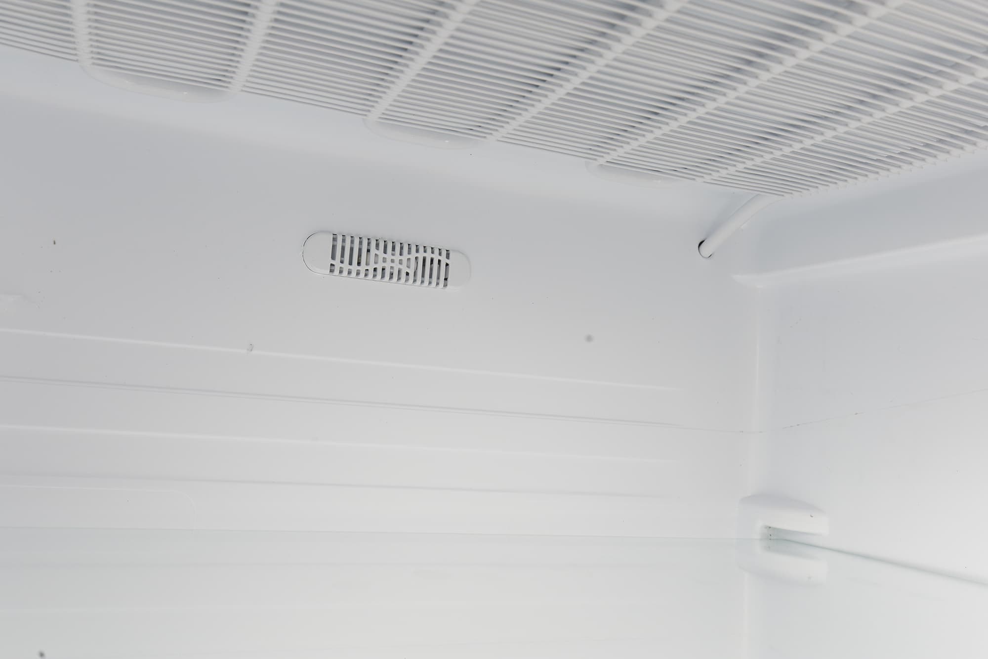 Над верхней перегородкой располагается испаритель, окрашенный белой эмалью. На задней стенке рядом с ним — решетка климатического датчика.