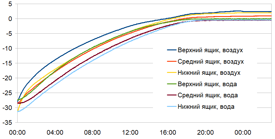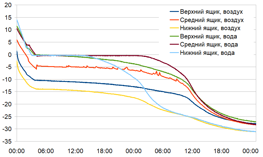 Для этого мы закрыли дверь морозилки при температуре балласта чуть ниже 10 °C, включили режим суперзаморозки и оставили прибор работать продолжительное время. Результаты измерений вы можете видеть на графике.
