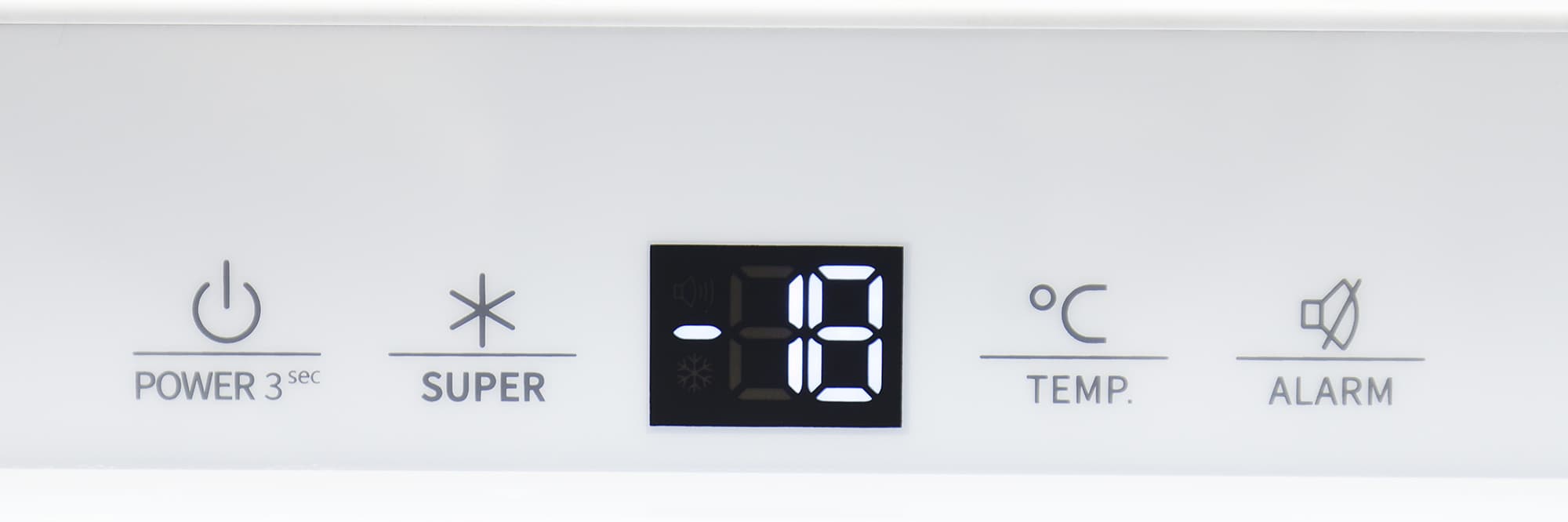 Включать и настраивать морозилку можно с панели на верхней кромке передней стенки, над дверцей. В центре у нее светодиодный дисплей, на котором крупно выведена установленная температура хранения.