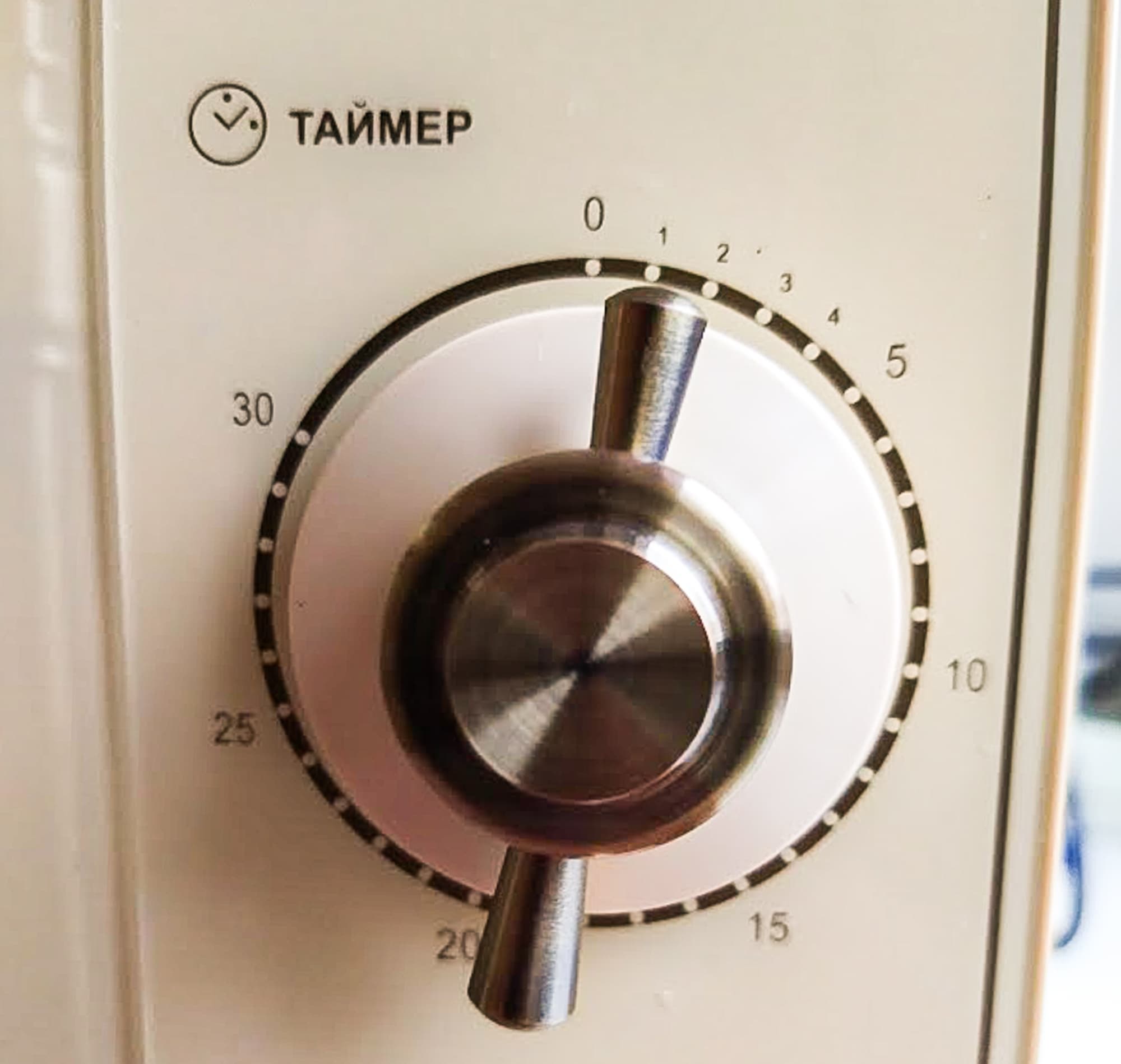 Придется приноровиться и к таймеру. Шаг установки — 1 минута, но, как выяснилось, рычажок переключателя может вас обмануть и печь не доработает секунд 30.