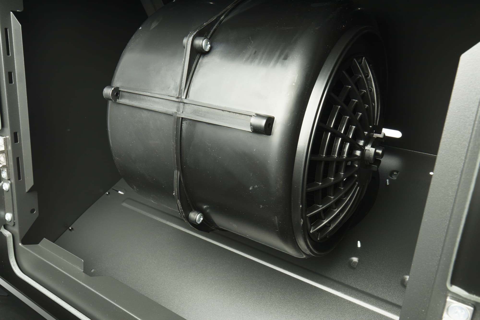 Сняв фильтр, мы можем получить доступ к электродвигателю с центробежным вентилятором. Воздух поступает в него через решетки на торцах цилиндра, где также есть крепления для дополнительных угольных фильтров.
