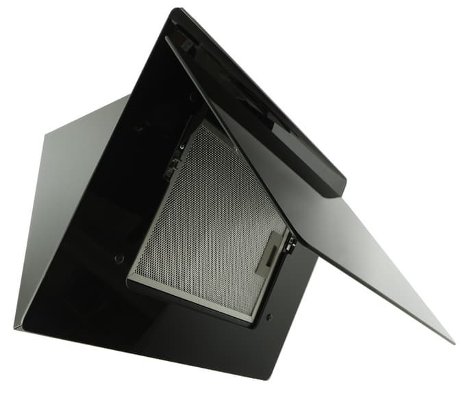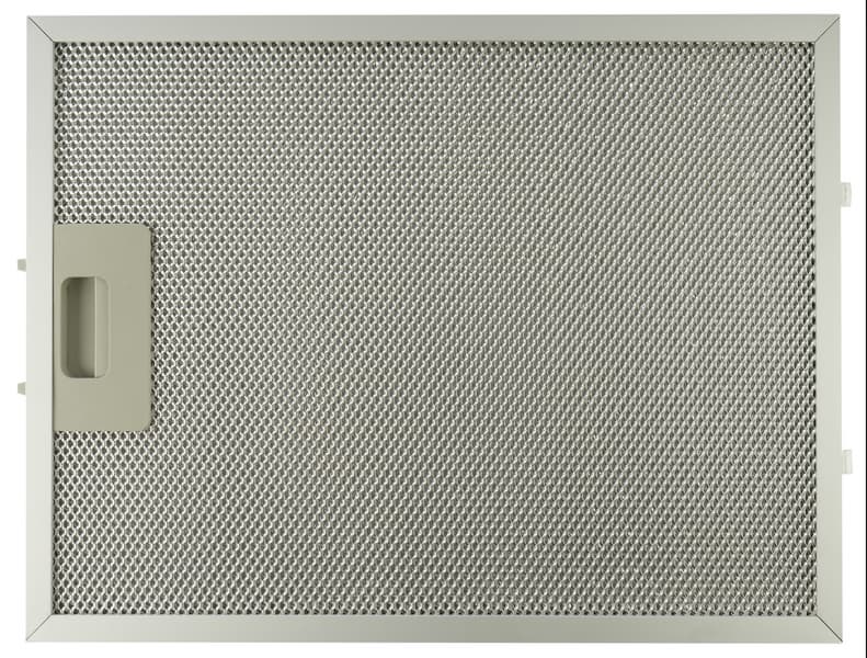 Антижировой фильтр, задерживающий брызги масла с плиты, представляет собой конструкцию из алюминия, смонтированную на металлической рамке. Он удерживается на месте с помощью серых пластиковых защелок.