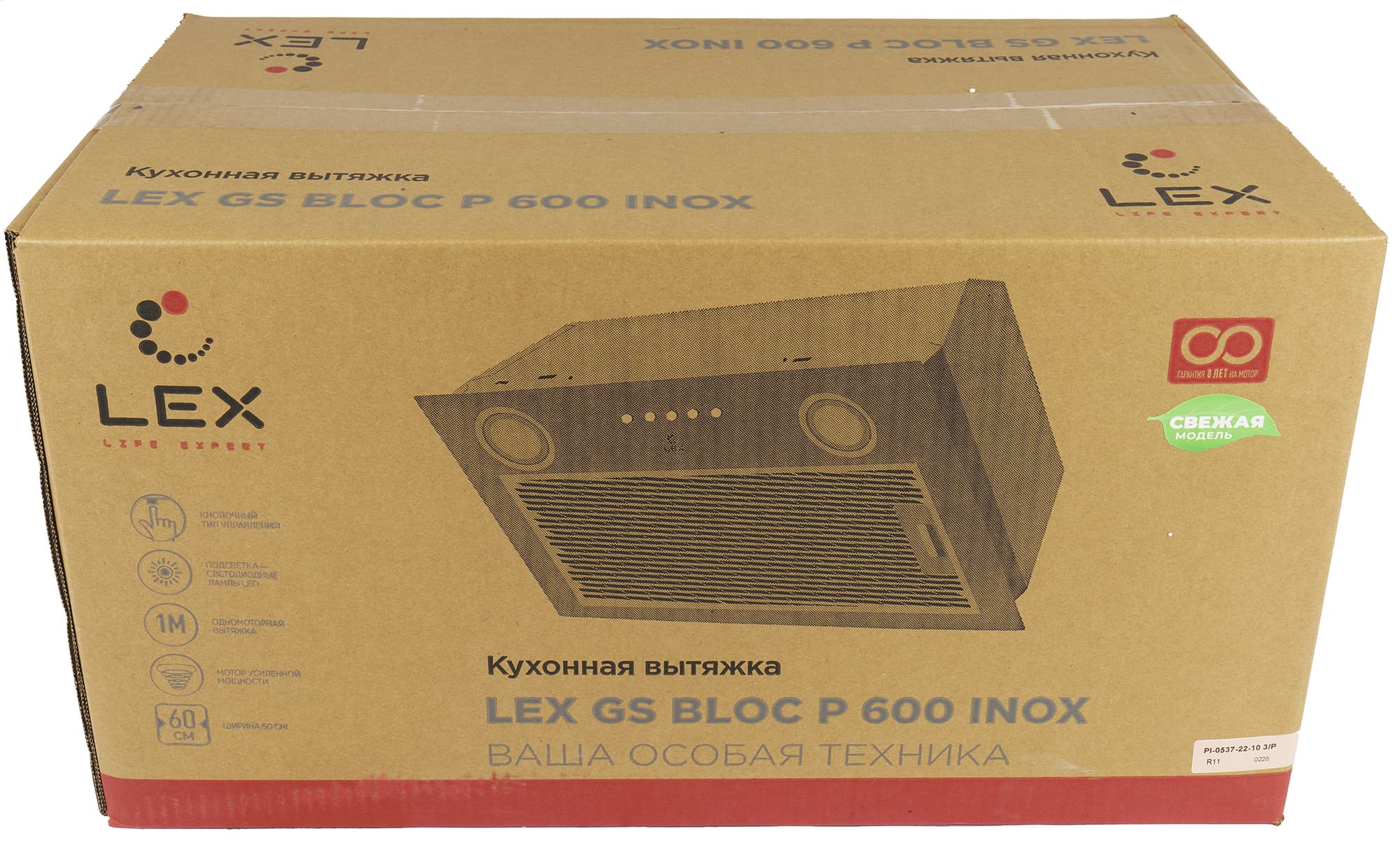 Вытяжка упакована в коричневую картонную коробку с двухцветной печатью. Как обычно, на передней стенке пользователь знакомится с изображением прибора, названием модели и логотипом компании. Здесь же можно узнать об основных свойствах и функциях GS Bloc P 600: это вытяжка шириной 60 сантиметров с кнопочным управлением, светодиодной подсветкой и одним мотором повышенной мощности.