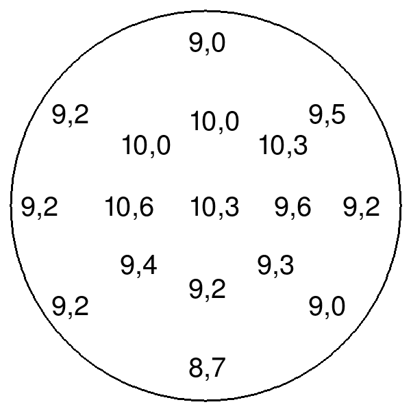 Исходя из полученной средней скорости вычисляется производительность вытяжки в кубометрах воздуха в минуту. Для Lex GS Bloc P 600 Inox результаты измерений выглядели следующим образом (цифры — скорость в метрах в секунду).