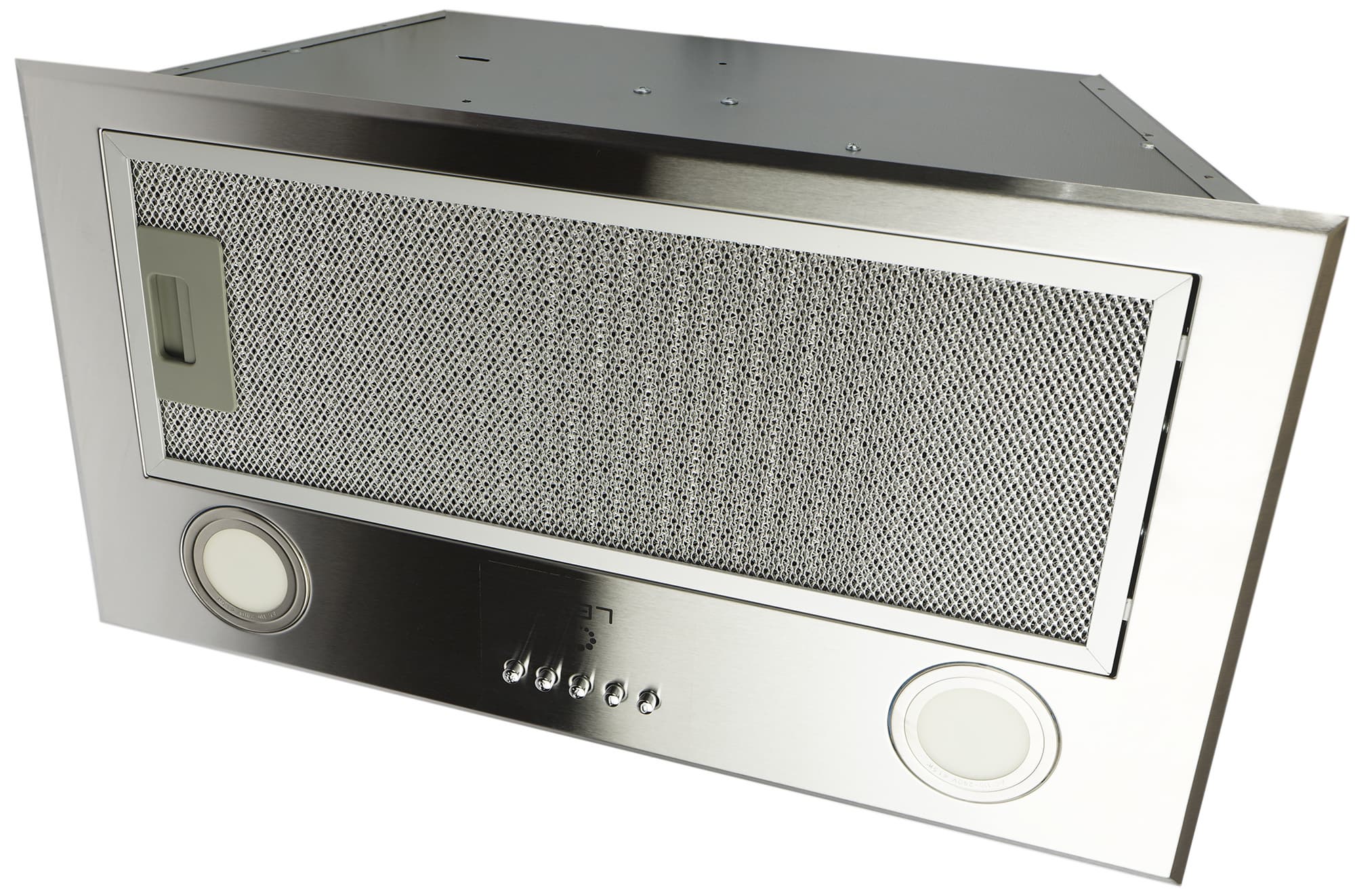 Большую часть нижней панели занимает прямоугольный жироулавливающий фильтр, сделанный из алюминия. Здесь же находятся два круглых плафона светодиодной подсветки, между которыми —кнопочная панель управления.
