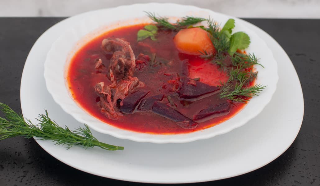 В 6-литровой кастрюле, установленной на вок-конфорку на минимум, мы сварили бульон из межреберной говядины. Параллельно с бульоном, в другой большой кастрюле мы отварили свеклу и морковь в кожуре. Почистили, порезали на сковородку диаметром 28 см и спассеровали в томатной пасте с нарезанными вялеными томатами.