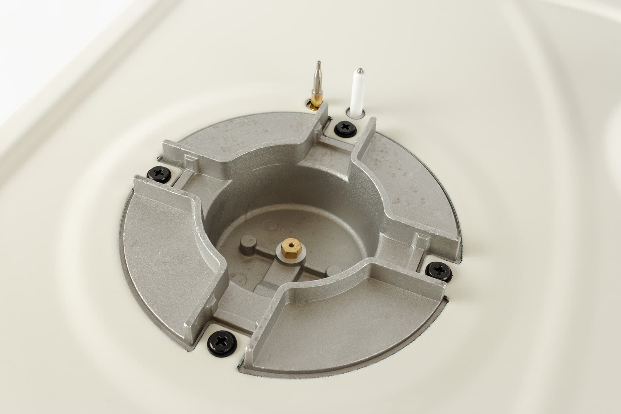 Конфорок в плите четыре. Большая (Wok) имеет мощность 3500 Вт с технологией «тройной короны», то есть с тремя рядами пламени. Конфорка состоит из большого рассекателя и двух отдельных крышек.