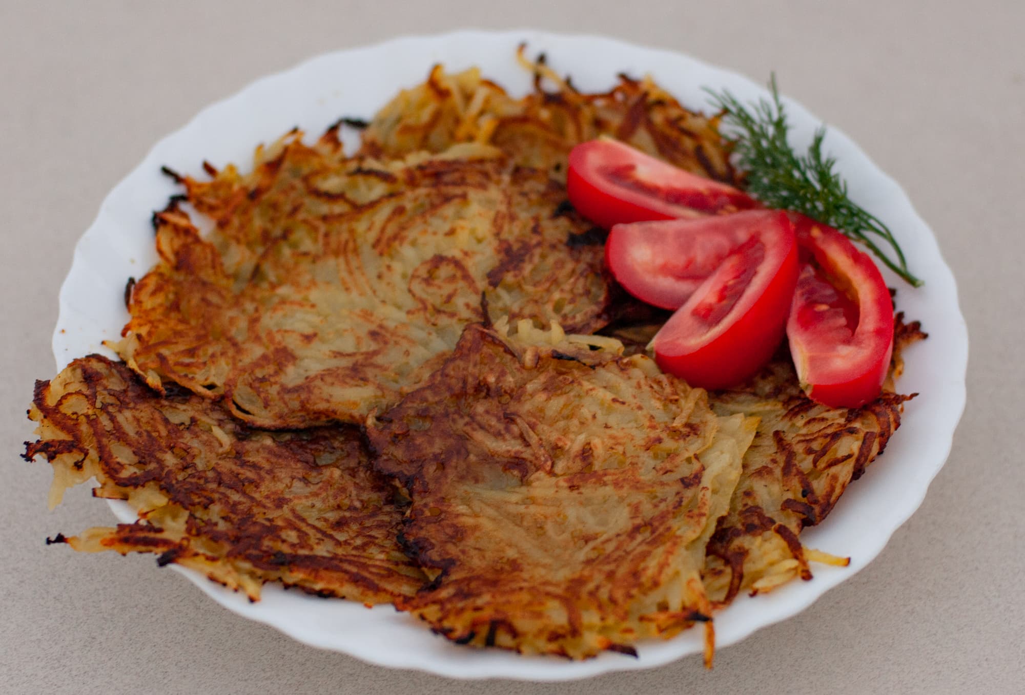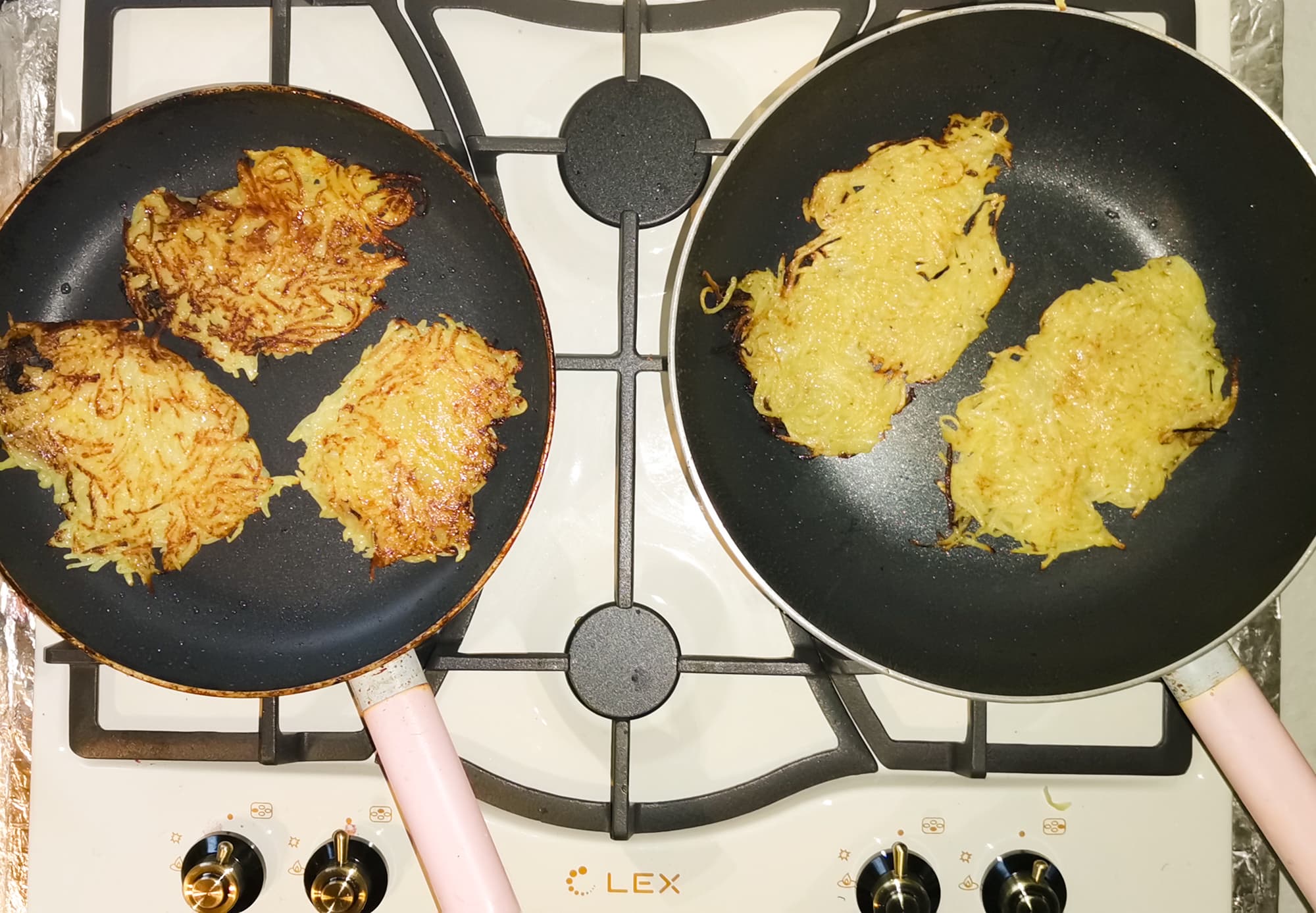 В мелко натертый картофель добавили яйцо, средний жарили без добавок. Готовили драники сразу на двух сковородках параллельно. Огонь пришлось поставить на допустимый минимум.