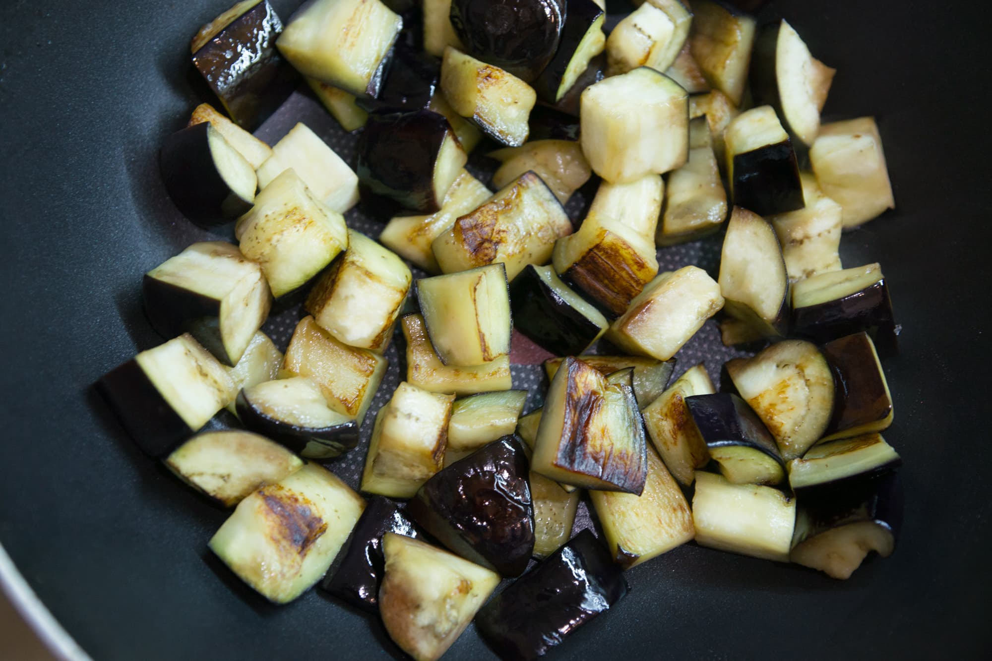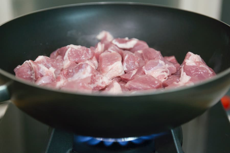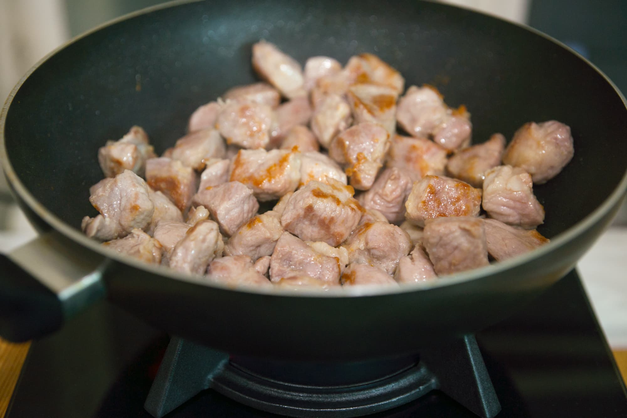 В глубокой сковороде на максимальном огне большой конфорки сначала обжарили нарезанную на небольшие кусочки свинину.