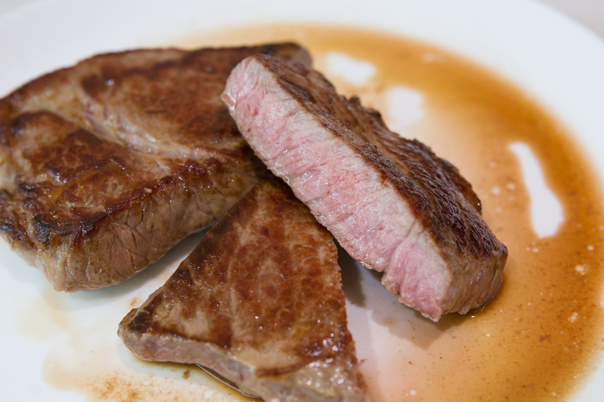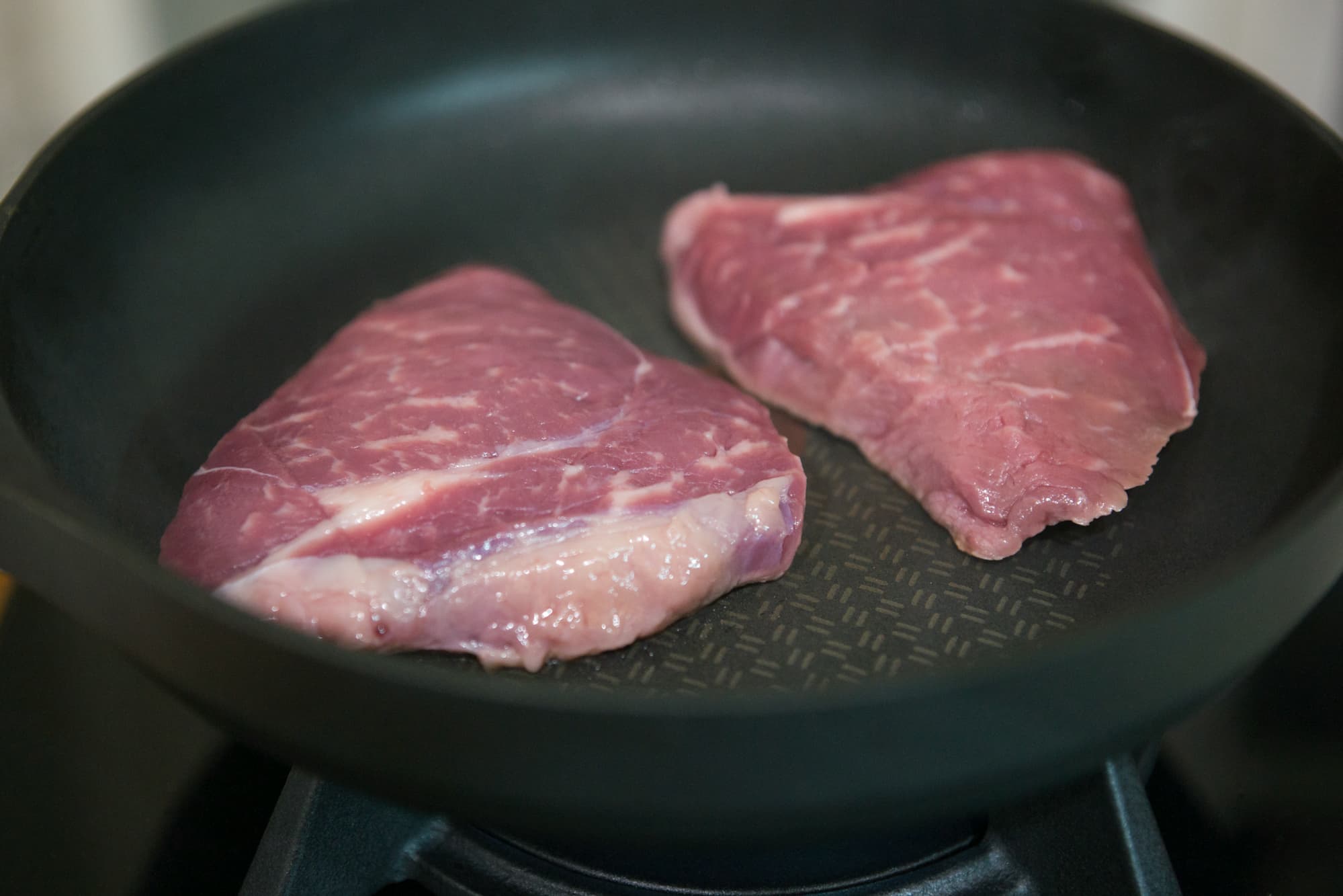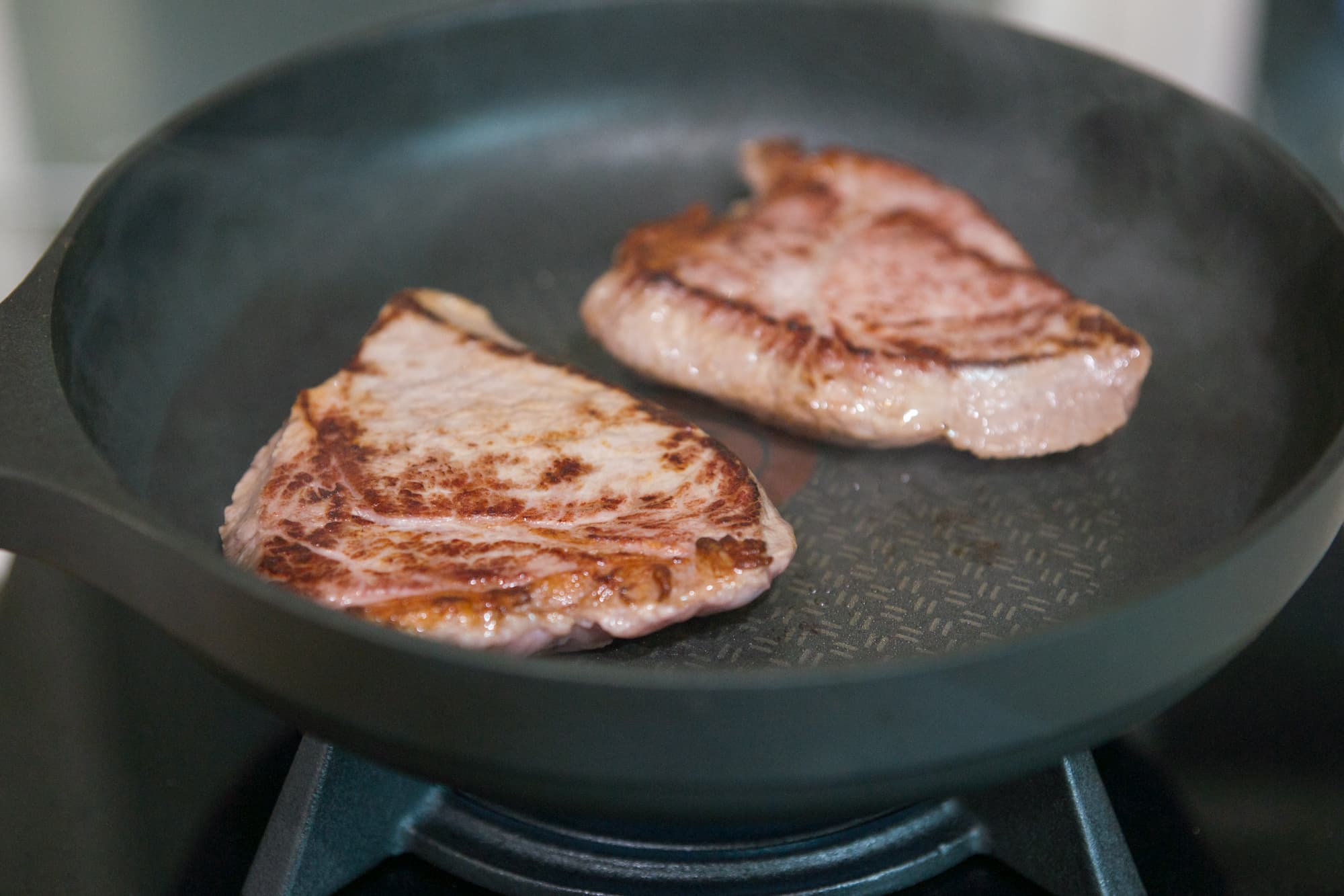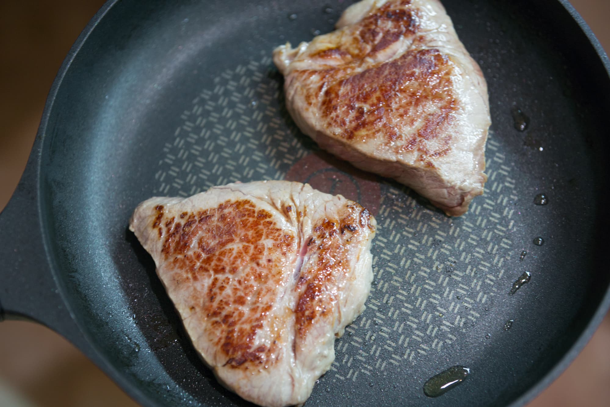 Мясо комнатной температуры выложили на раскаленную сковороду, поставили регулятор на максимум и за несколько минут обжарили стейк с обеих сторон до появления аппетитной румяной корочки. Снизили огонь до среднего уровня и продержали мясо еще минуту.
