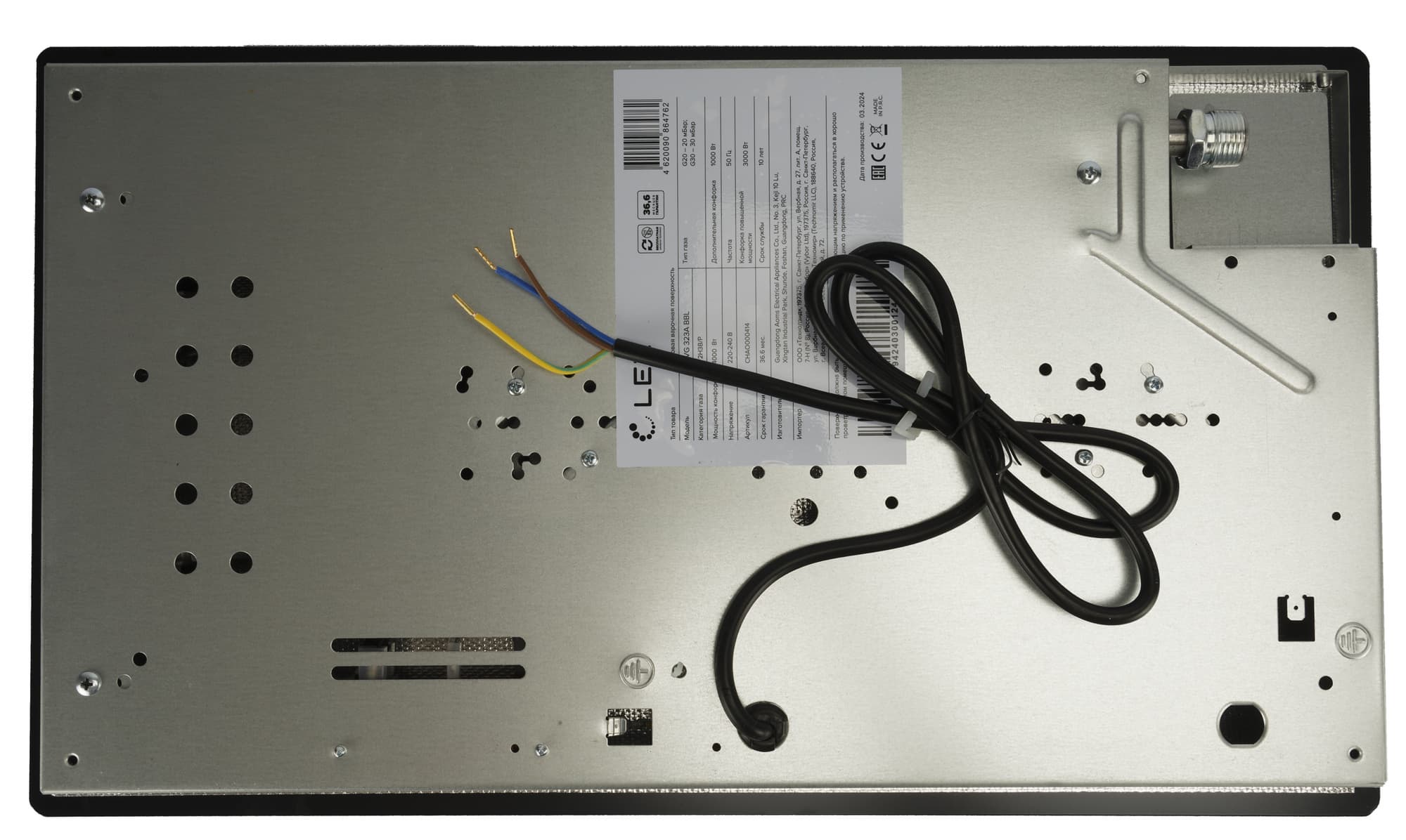 Нижняя часть корпуса закрыта металлом. На дне можно увидеть небольшие вентиляционные отверстия и наклейку с техническими характеристиками устройства. Тут же находятся крепление сетевого кабеля и газовая труба для подключения к магистральному или баллонному газу.