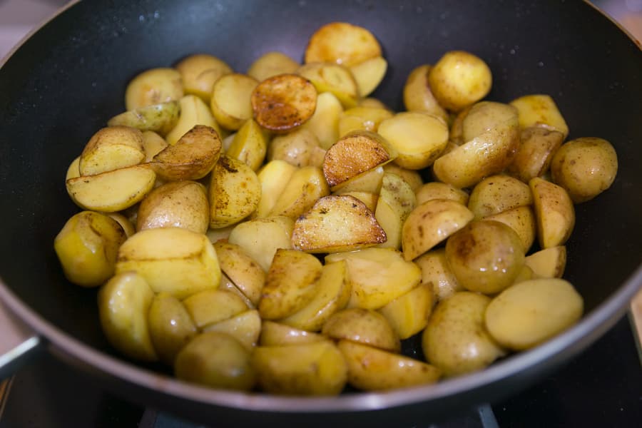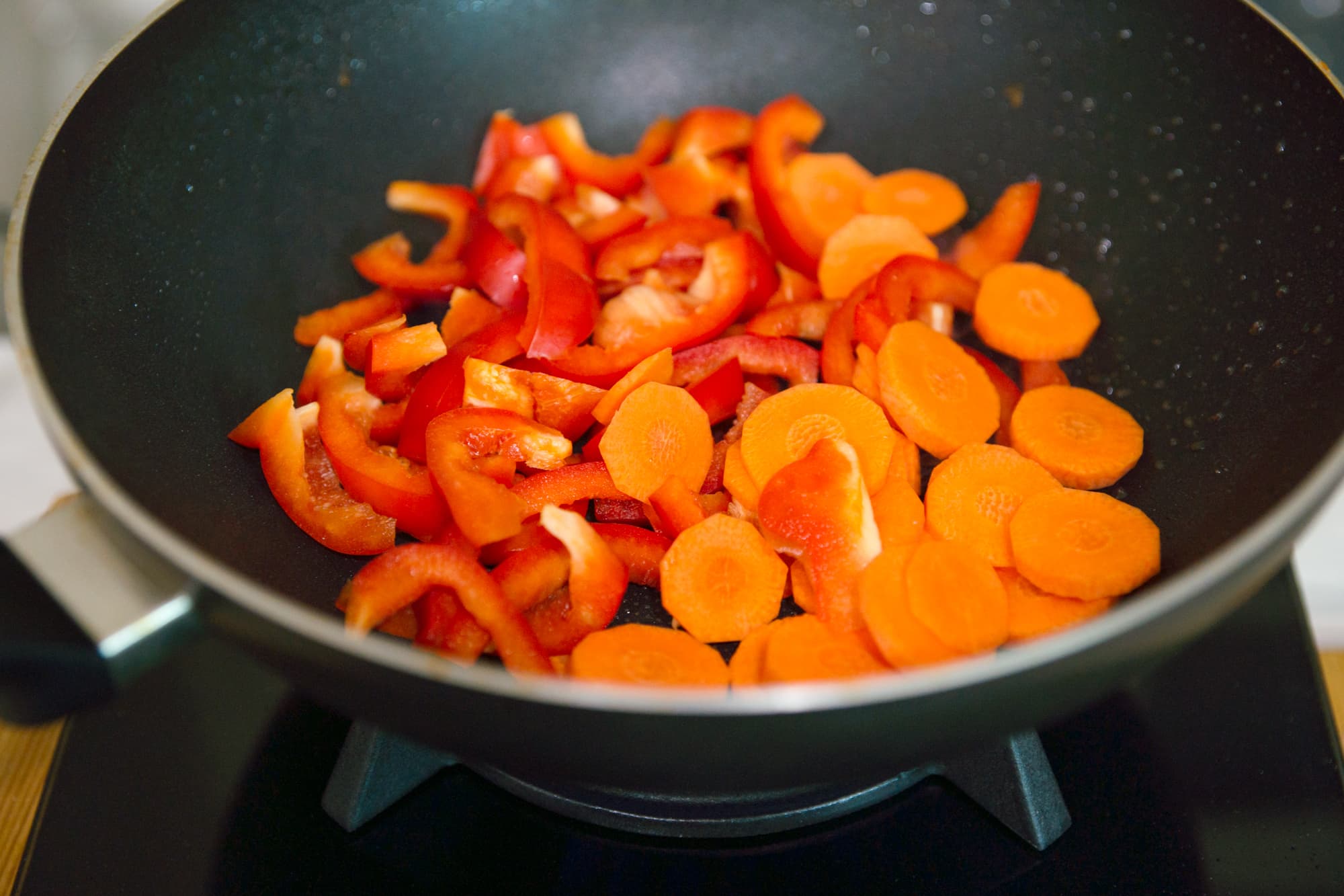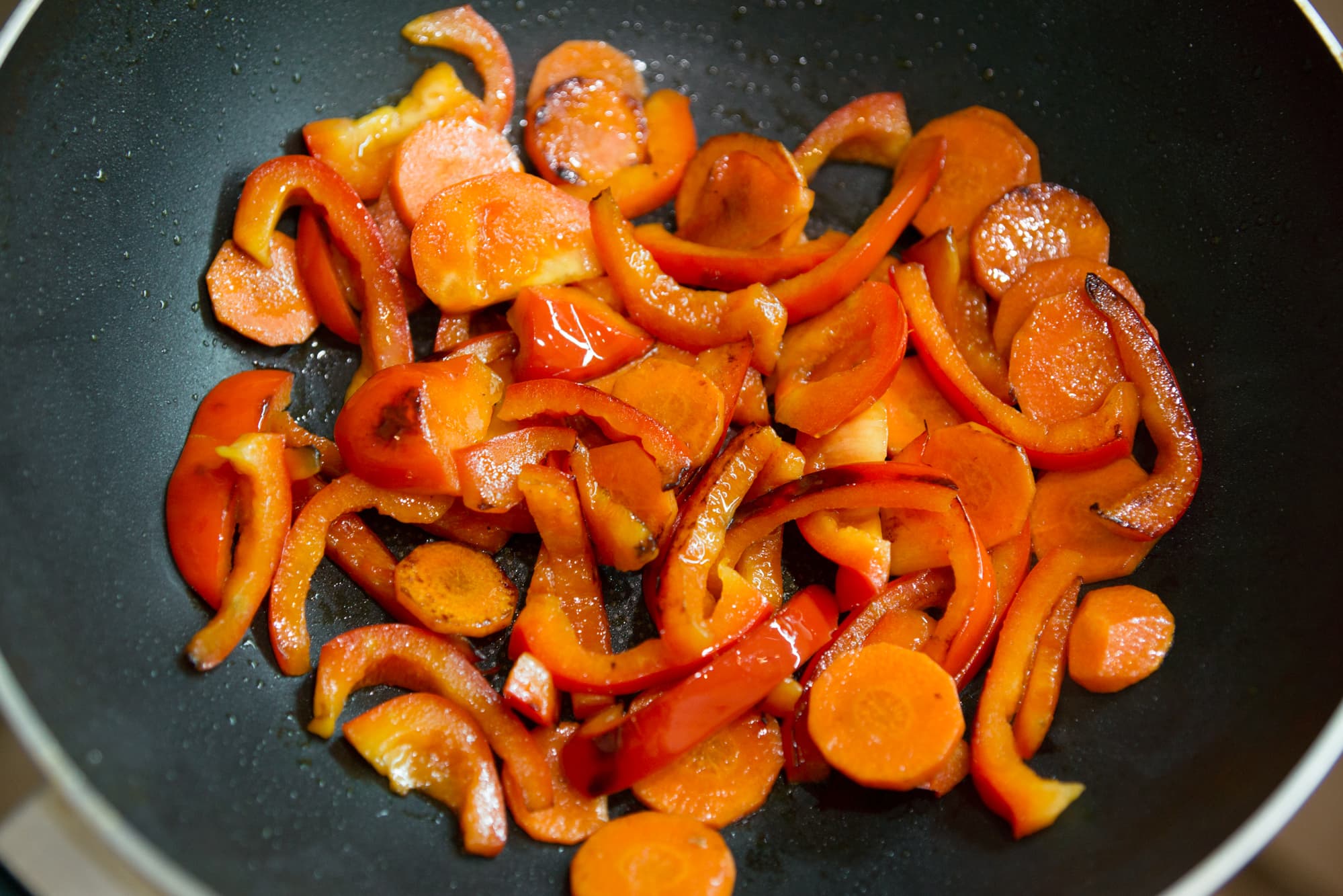 Потом обжарили морковь с болгарским перцем, затем картофель.