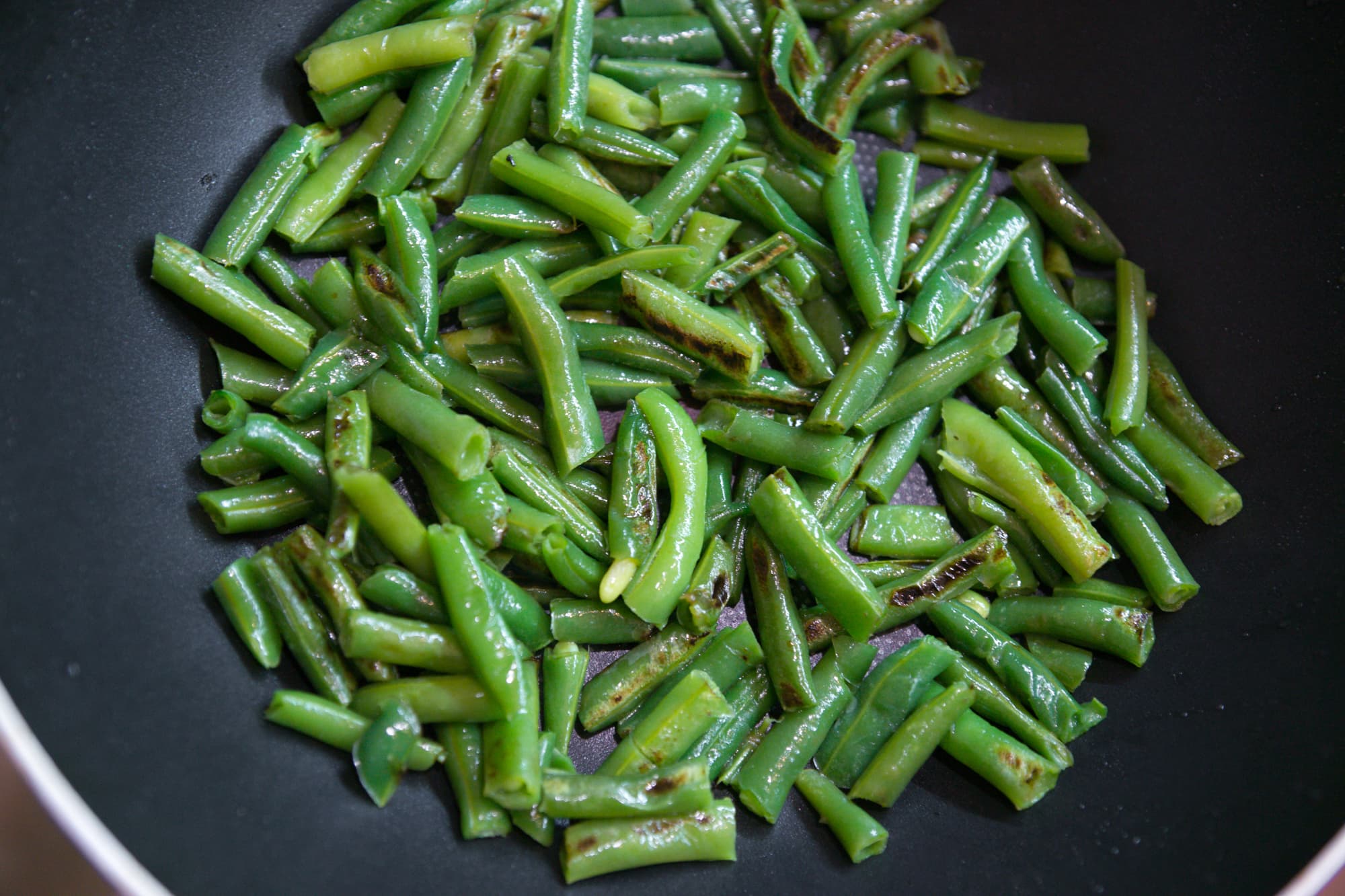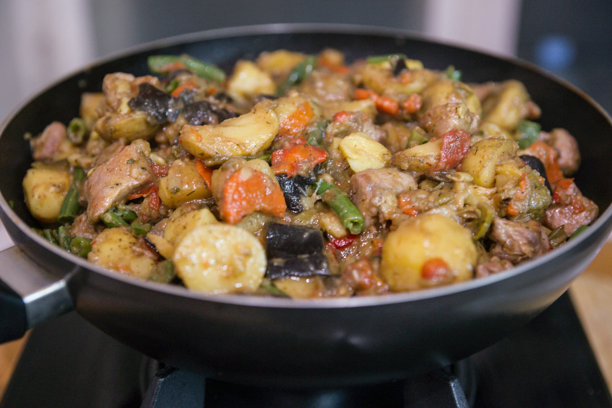 Соединили всё, кроме фасоли, вместе в той же посудине, добавили помидоры, несколько долек чеснока, соль и специи. Перемешали, накрыли крышкой и поставили на маленькую конфорку на средний огонь. Когда жаркое уже почти приготовилось, добавили фасоль, перемешали, уменьшили пламя до минимума и оставили потомиться еще ненадолго.