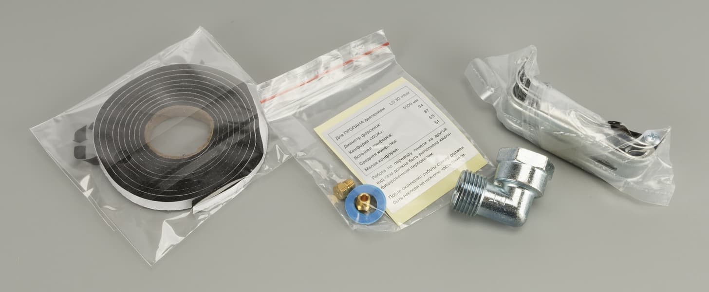 В комплекте предусмотрен набор жиклеров для баллонного газа (жиклеры для магистрального уже установлены), угловой штуцер, крепежи и уплотнительная лента. Эти детали понадобятся при встраивании и подключении.